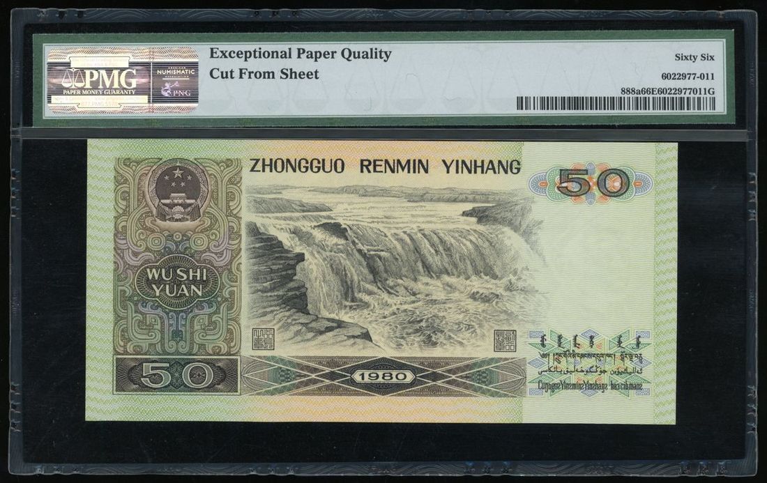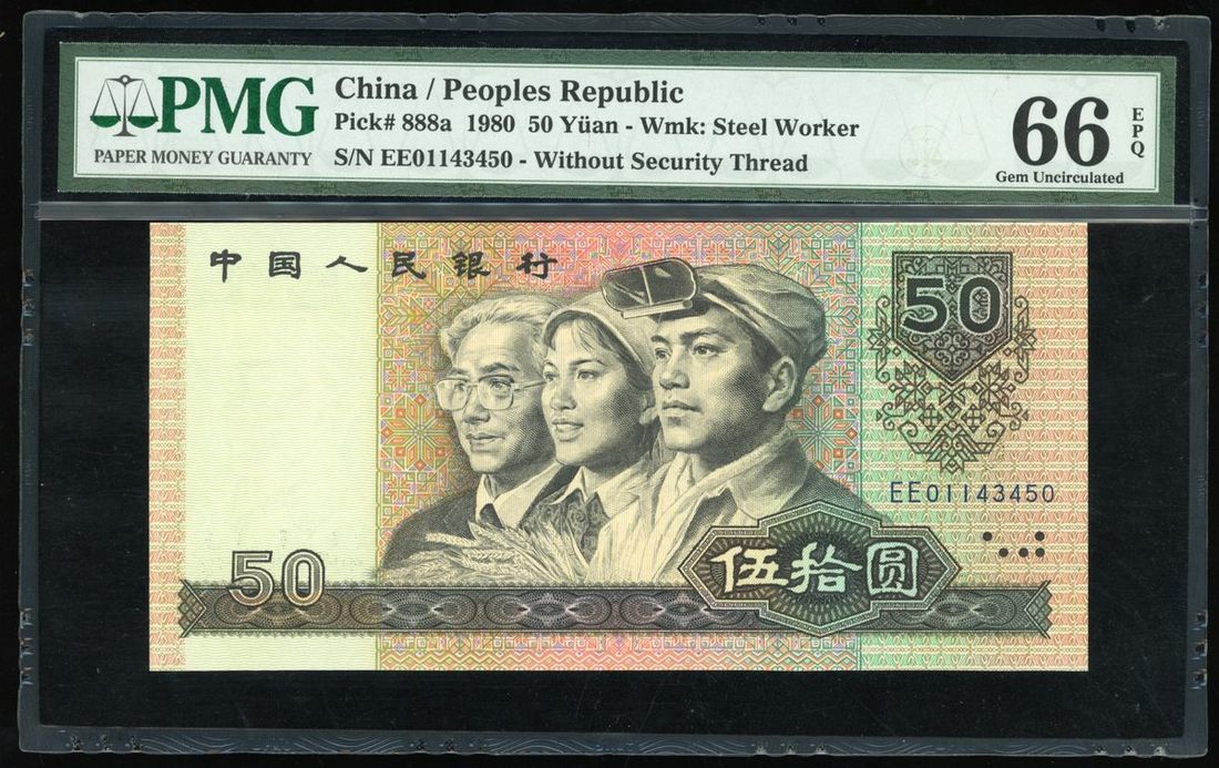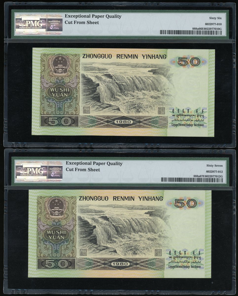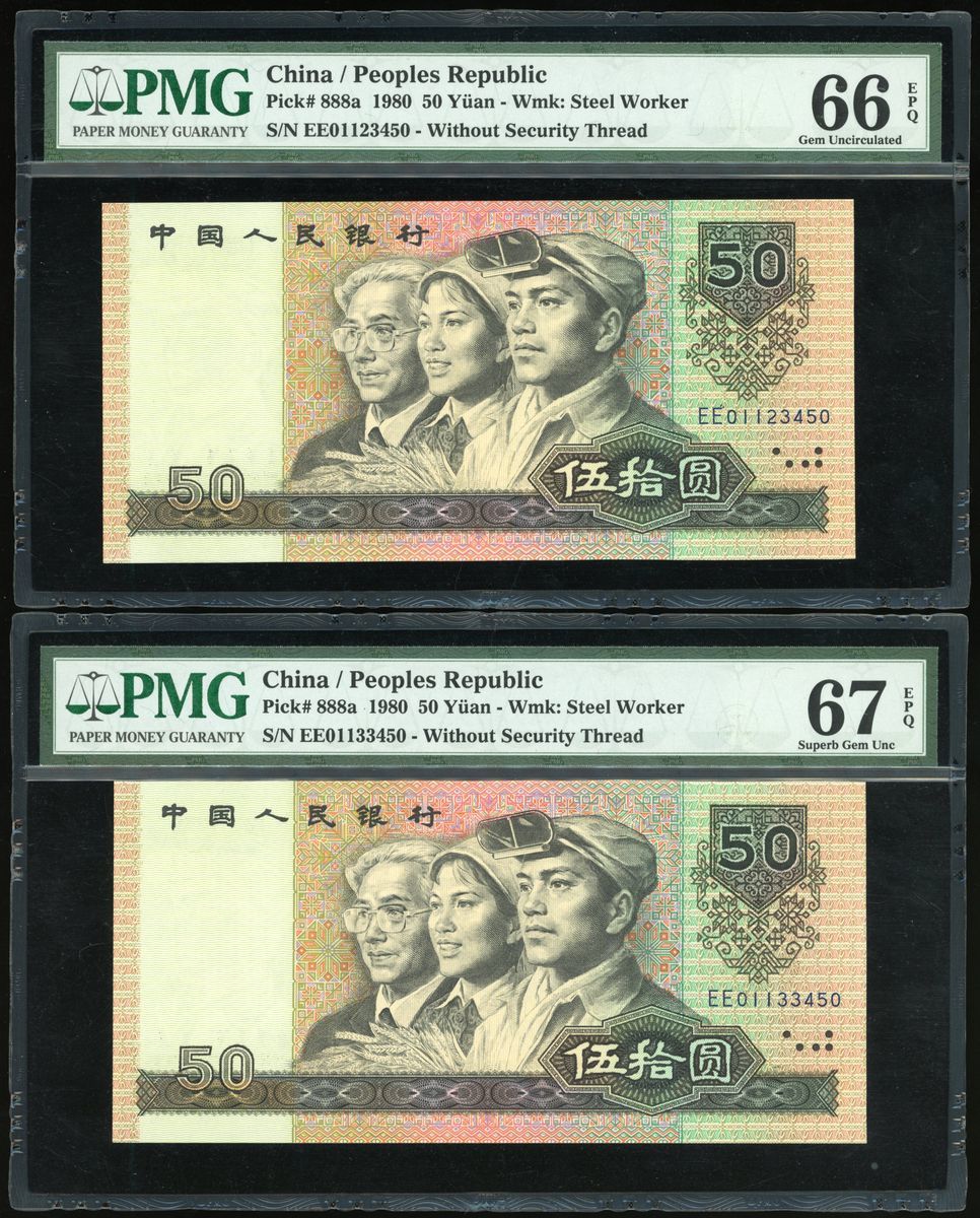 People's Bank of China, 4th Series Renminbi, 1980, 50 yuan (3), serial number EE01123450, EE011334560, EE01143450, (Pick 888a), PMG 66EPQ Gem Uncirculated, 67EPQ, Superb Gem Uncirculated, 66EPQ Gem Uncirculated
