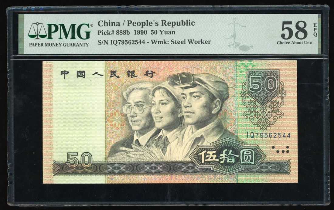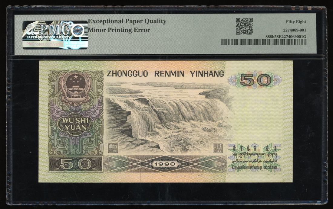 People's Bank of China, 4th Series Renminbi, 1990, ERROR 50 yuan, serial number IQ79562544, (Pick 888b), PMG 58EPQ, minor printing error.
