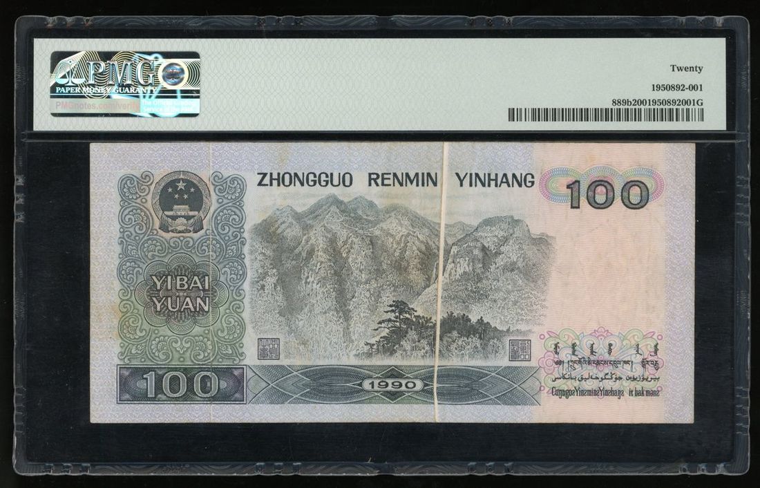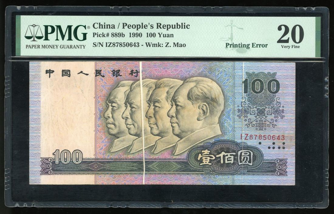 People's Bank of China 4th Series Renminbi, 1990, ERROR 100 Yuan, serial number IZ87850643, gutterfold error, (Pick 889b), PMG 20 Very Fine