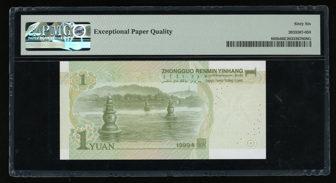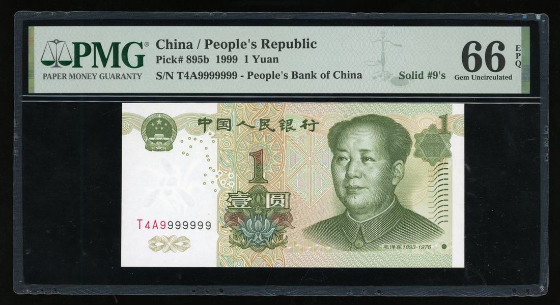 People's Bank of China, 5th Series Renminbi, 1999, 1 yuan, solid serial number T4A9999999, (Pick 895b), PMG 66EPQ Gem Uncirculated