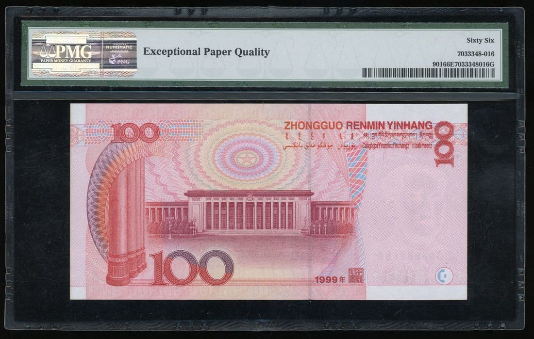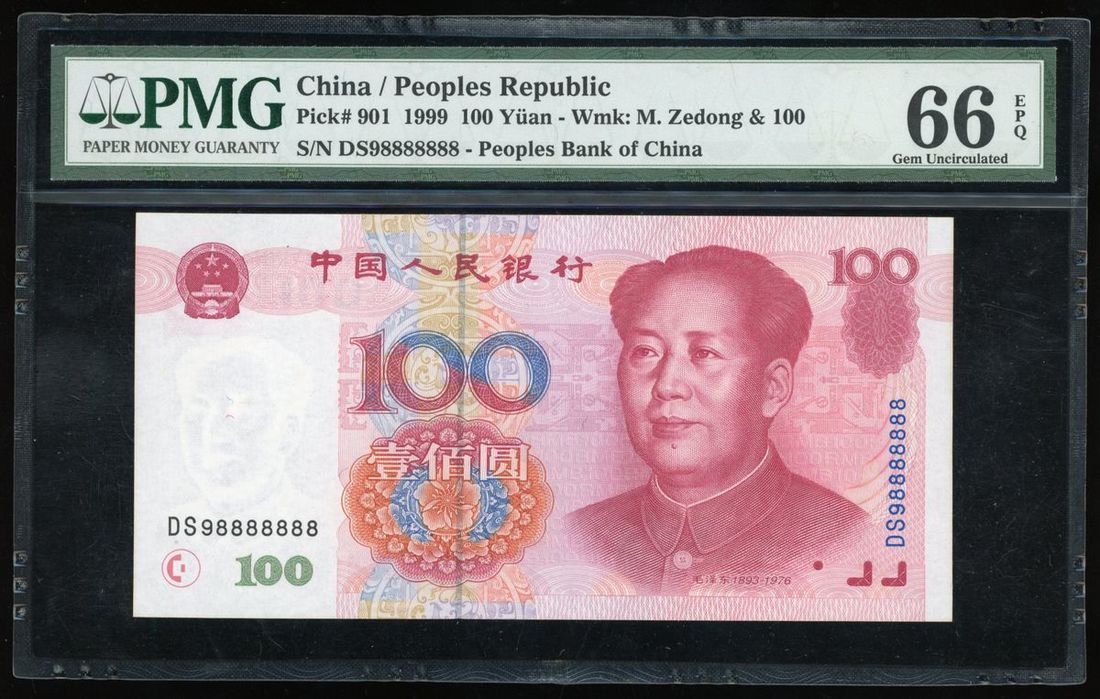 People's Bank of China, 5th Series Renminbi, 1999, 100 yuan, lucky serial number DS98888888, (Pick 901), PMG 66EPQ Gem Uncirculated. Near super solid