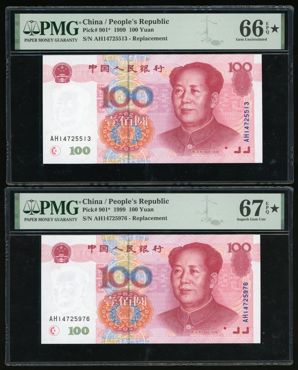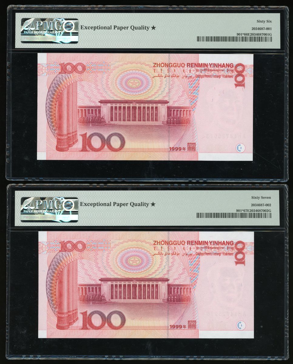 People's Bank of China, 5th Series Renminbi, 1999, 100 yuan (2), serial numbers AH14725513 and AH14725976, (Pick 901), graded PMG 66EPQ* Gem Unciculated and 67EPQ* Supberb Gem Uncirculated (2)