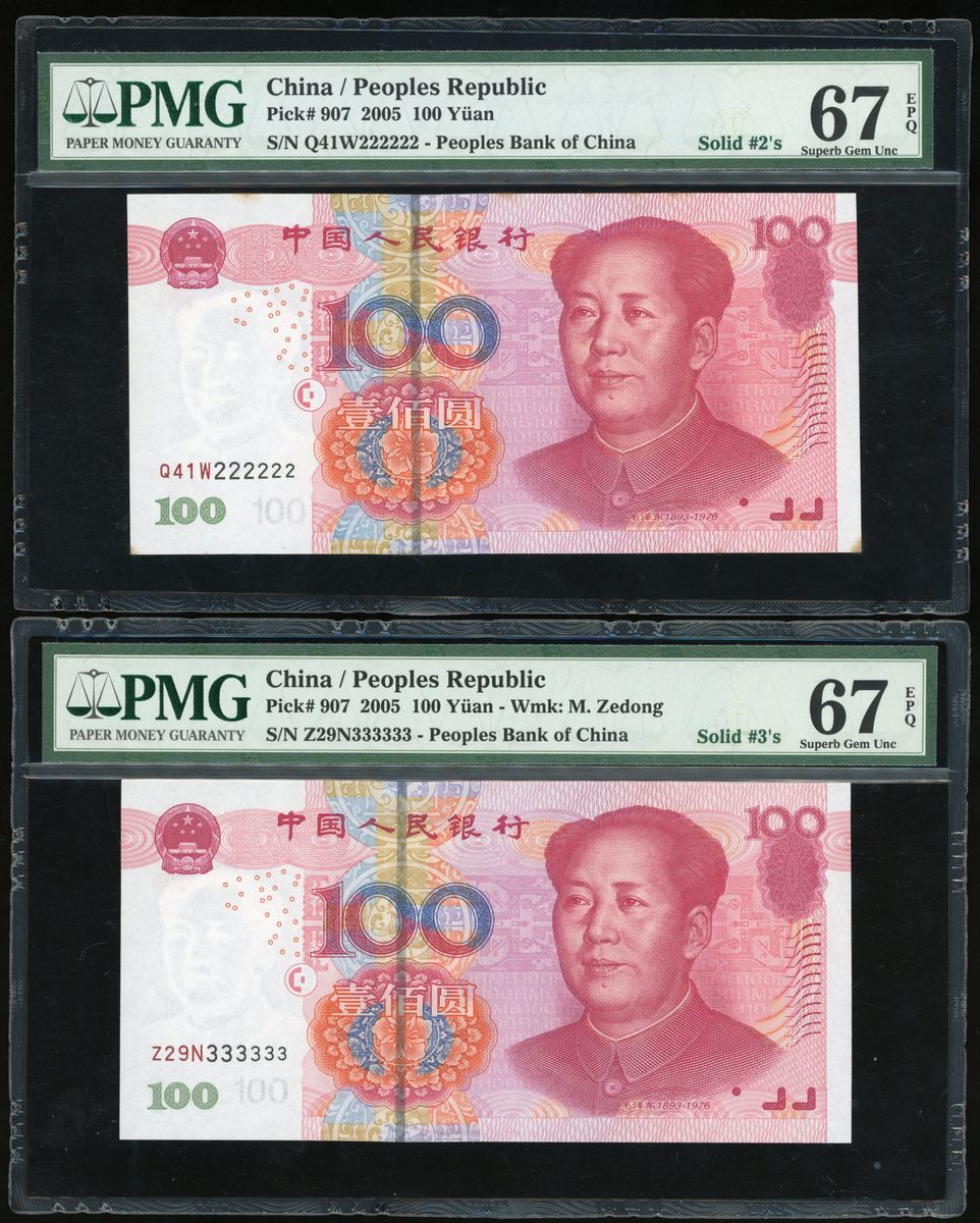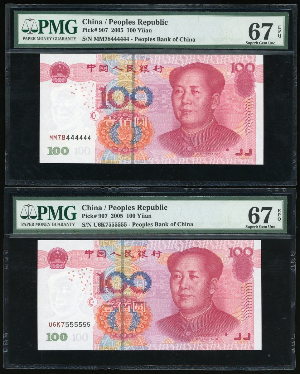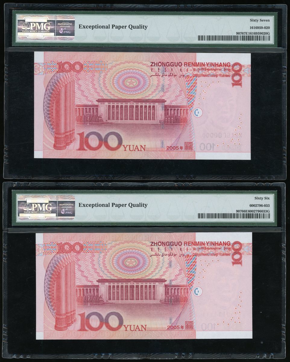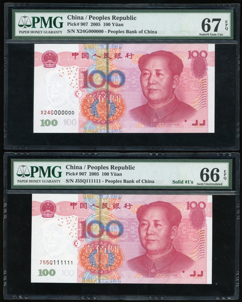 People's Bank of China, 5th Series Renminbi, 2005, 100 yuan (10), all with solid serial numbers, including: X24G 000000, J55Q 111111, Q41W 222222, Z29N 333333, MM78 444444, U6K7 555555, A64Y 666666, N4J3 777777, P72W 888888, J11P 999999,