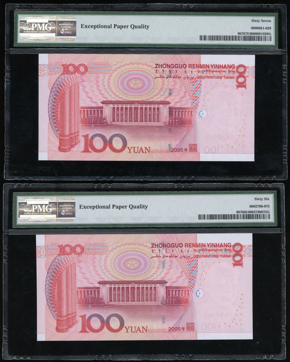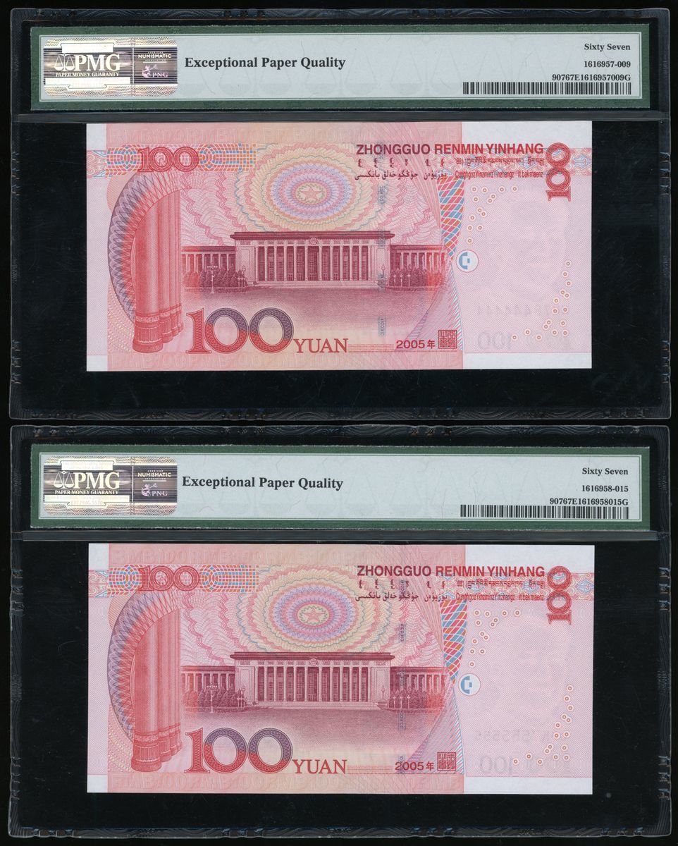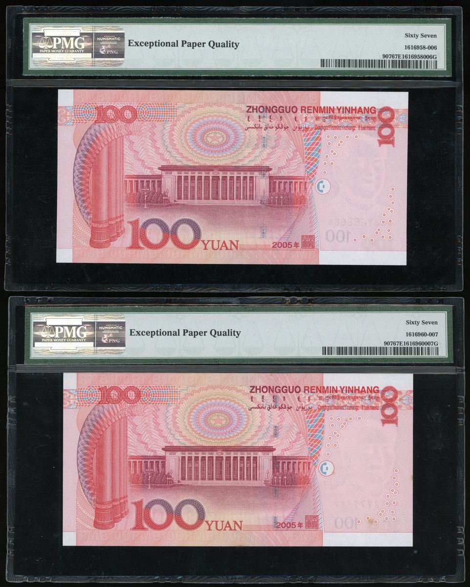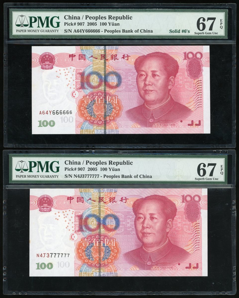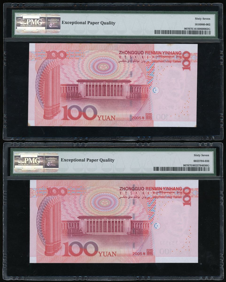 People's Bank of China, 5th Series Renminbi, 2005, 100 yuan (10), all with solid serial numbers, including: X24G 000000, J55Q 111111, Q41W 222222, Z29N 333333, MM78 444444, U6K7 555555, A64Y 666666, N4J3 777777, P72W 888888, J11P 999999,