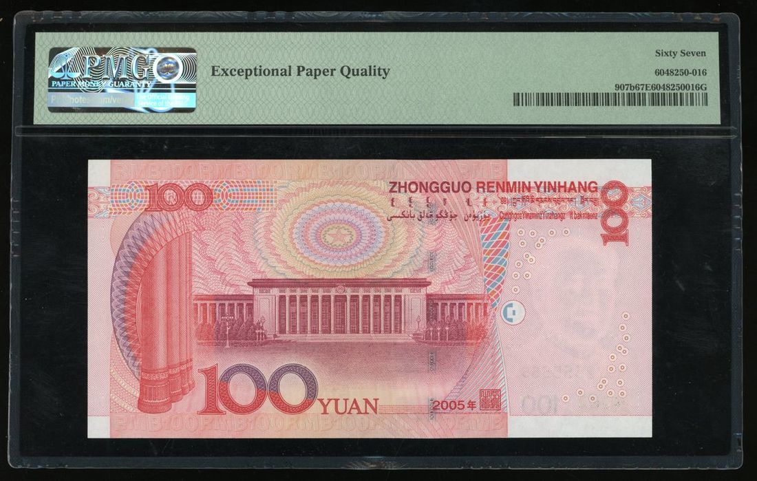 People's Bank of China, 5th Series Renminbi, 2005, 100 yuan, serial number A3Y2555555, (Pick 907b), PMG 67EPQ Superb Gem Uncirculated