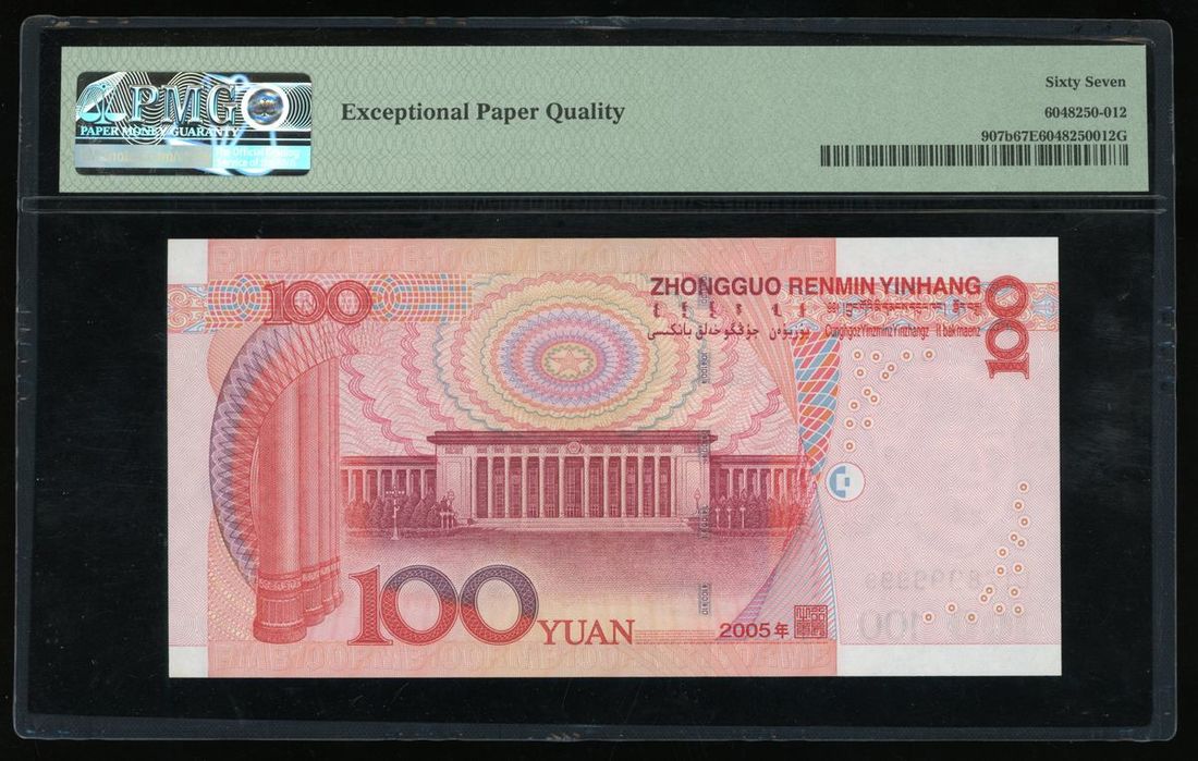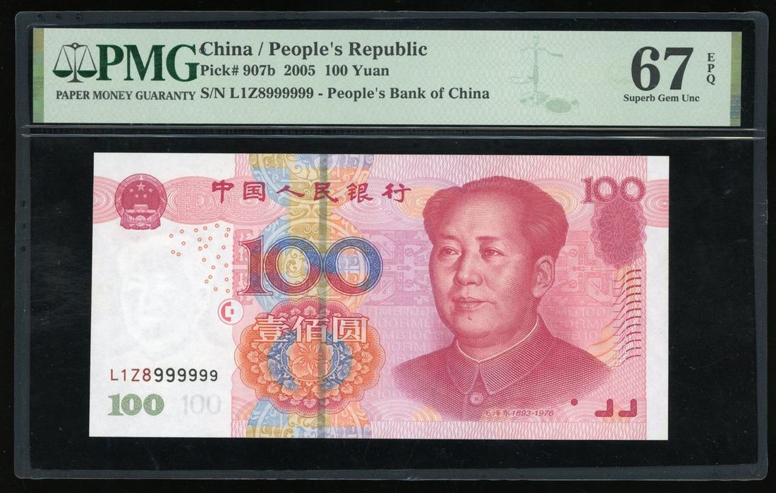 People's Bank of China, 5th Series Renminbi, 2005, 100 yuan, serial number L1Z8999999, (Pick 907b), PMG 67EPQ Superb Gem Uncirculated