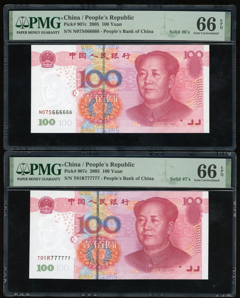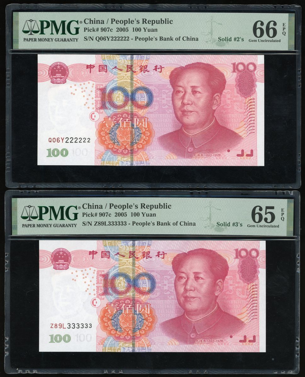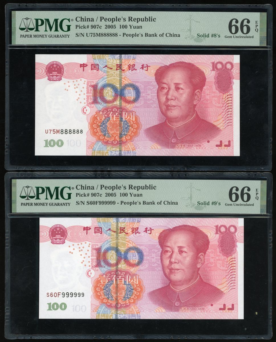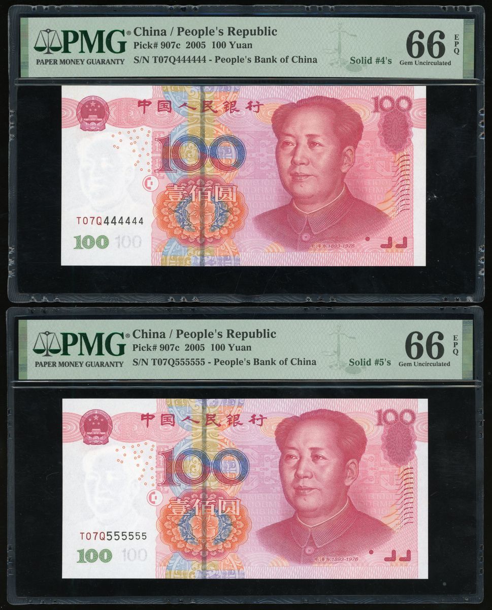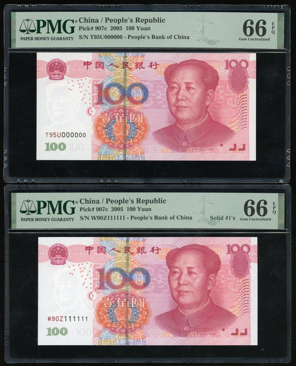 People's Bank of China, 5th Series Renminbi, 2005, 100 yuan (10), solid serial number T95U000000,W90Z111111, Q06Y222222, Z89L333333, T07Q444444, T07Q555555, N07S666666, T01R777777, U75M888888, S50F999999, (Pick 907c), PMG 65-66EPQ (10)