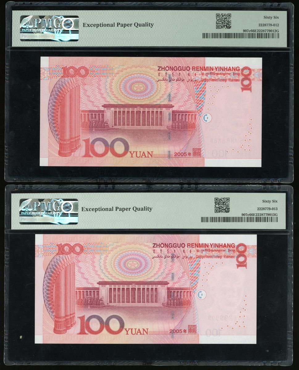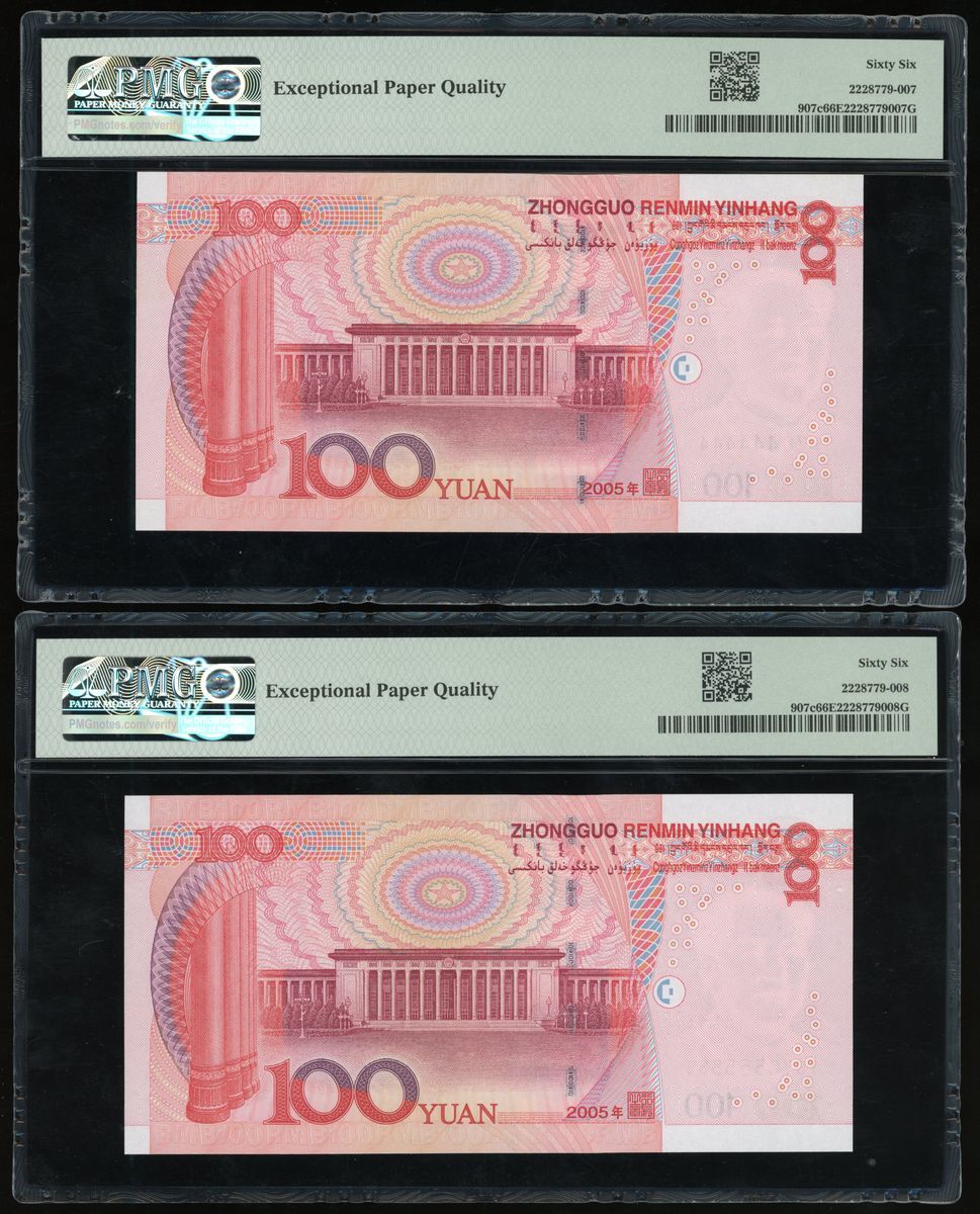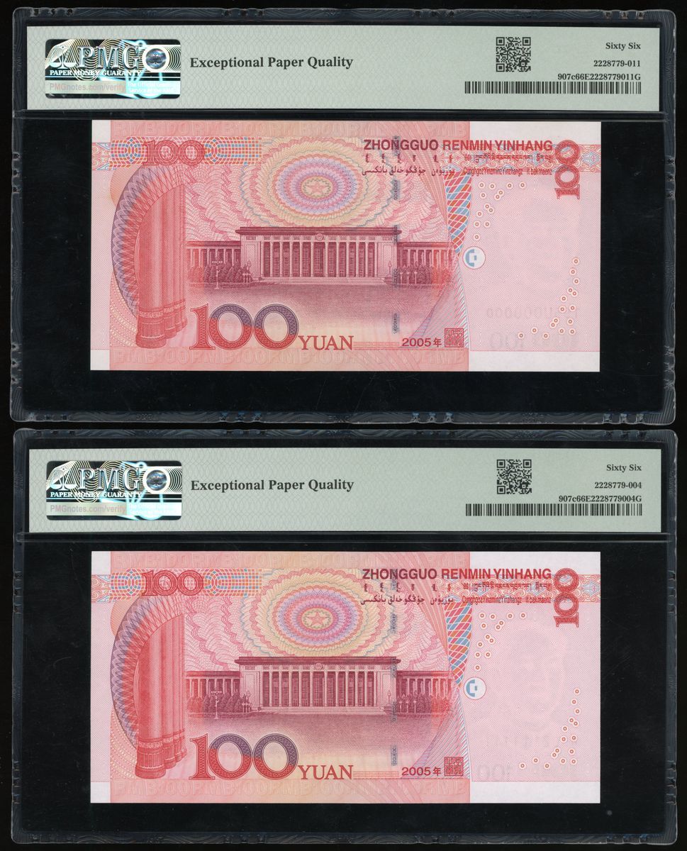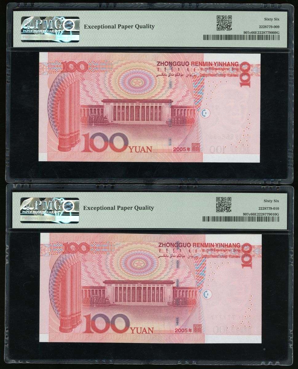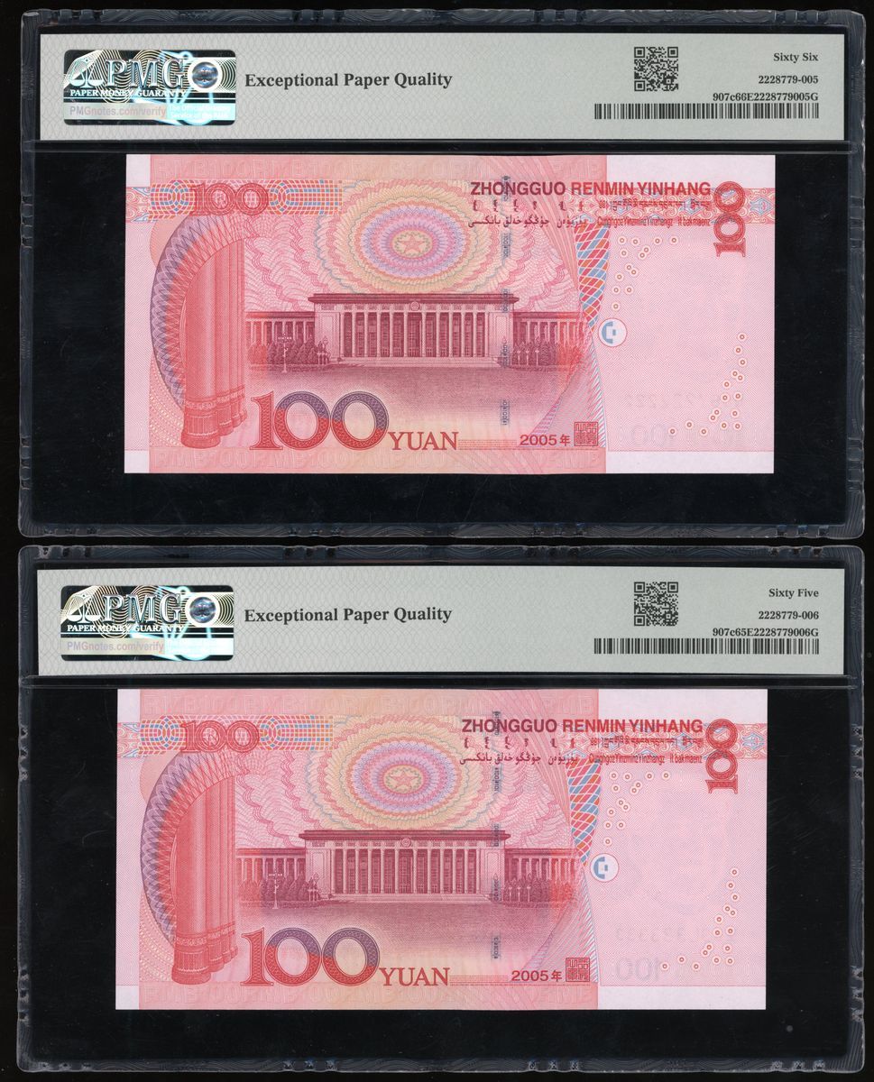 People's Bank of China, 5th Series Renminbi, 2005, 100 yuan (10), solid serial number T95U000000,W90Z111111, Q06Y222222, Z89L333333, T07Q444444, T07Q555555, N07S666666, T01R777777, U75M888888, S50F999999, (Pick 907c), PMG 65-66EPQ (10)
