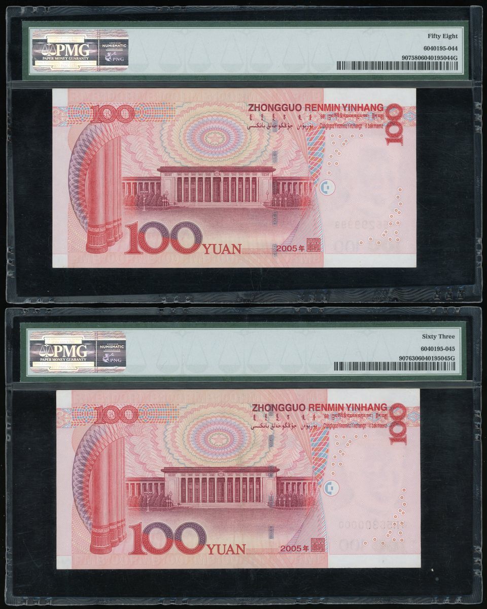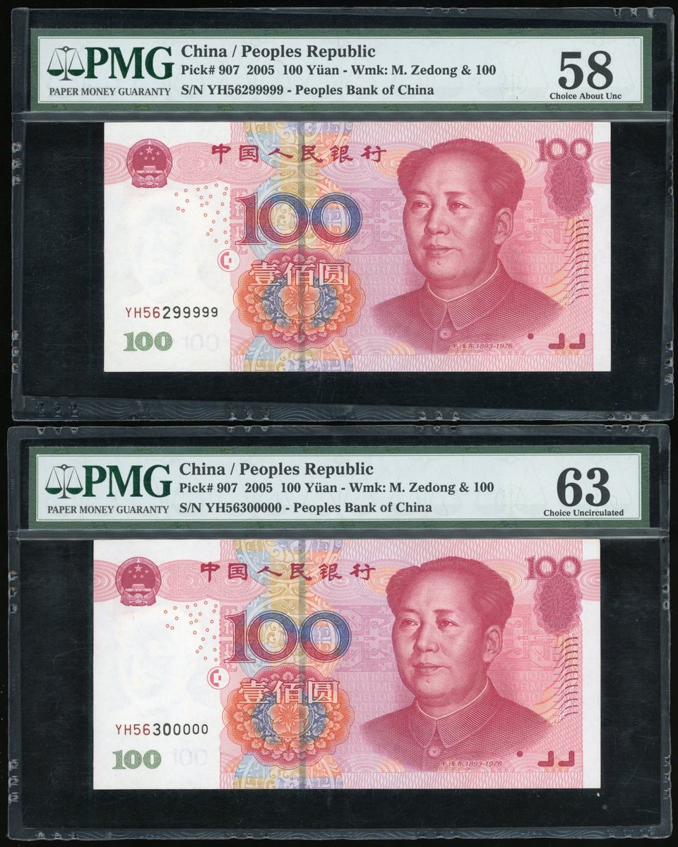 People's Bank of China, 5th Series Renminbi, 2015, 100 Yuan (2), 2005, serial number YH56299999, YH56300000, (Pick 907), PMG 58 Choice About Uncirculated, 63 Choice Uncirculated