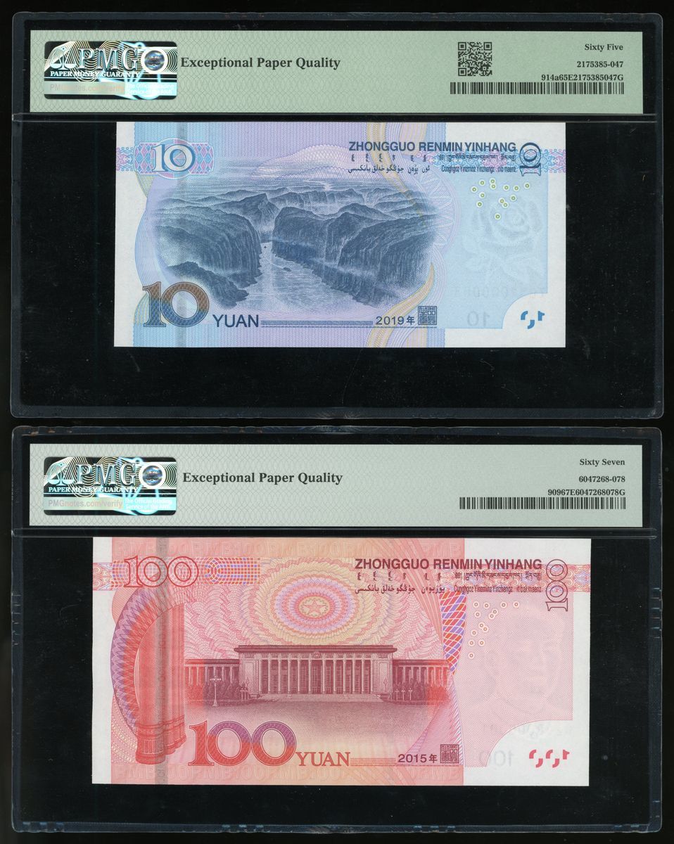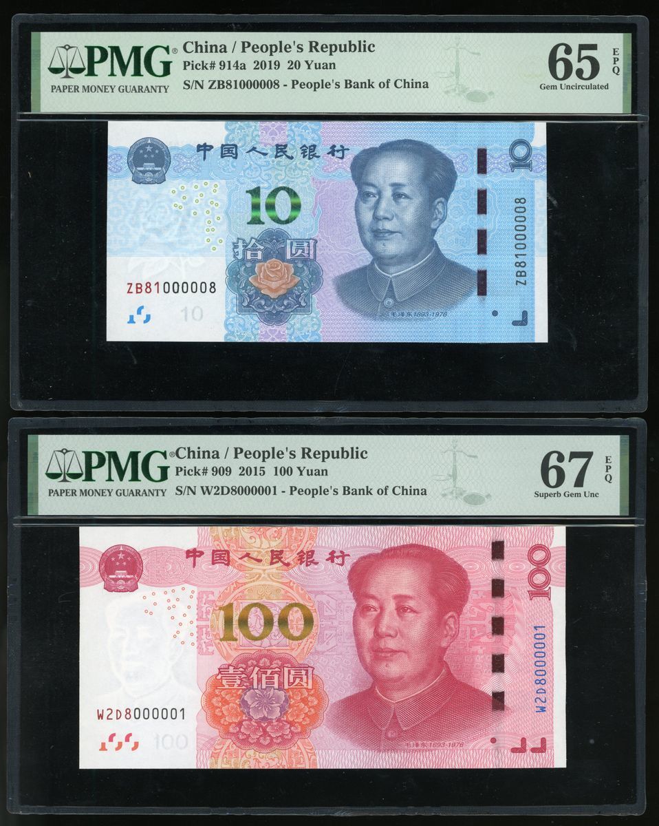 People's Bank of China, 5th Series Renminbi, 10 yuan, 2019, serial number ZB81000008 and 100 yuan, 2015, serial number W2D8000001, (Pick 914a, 909), PMG 65EPQ and 67EPQ respectively.(2)