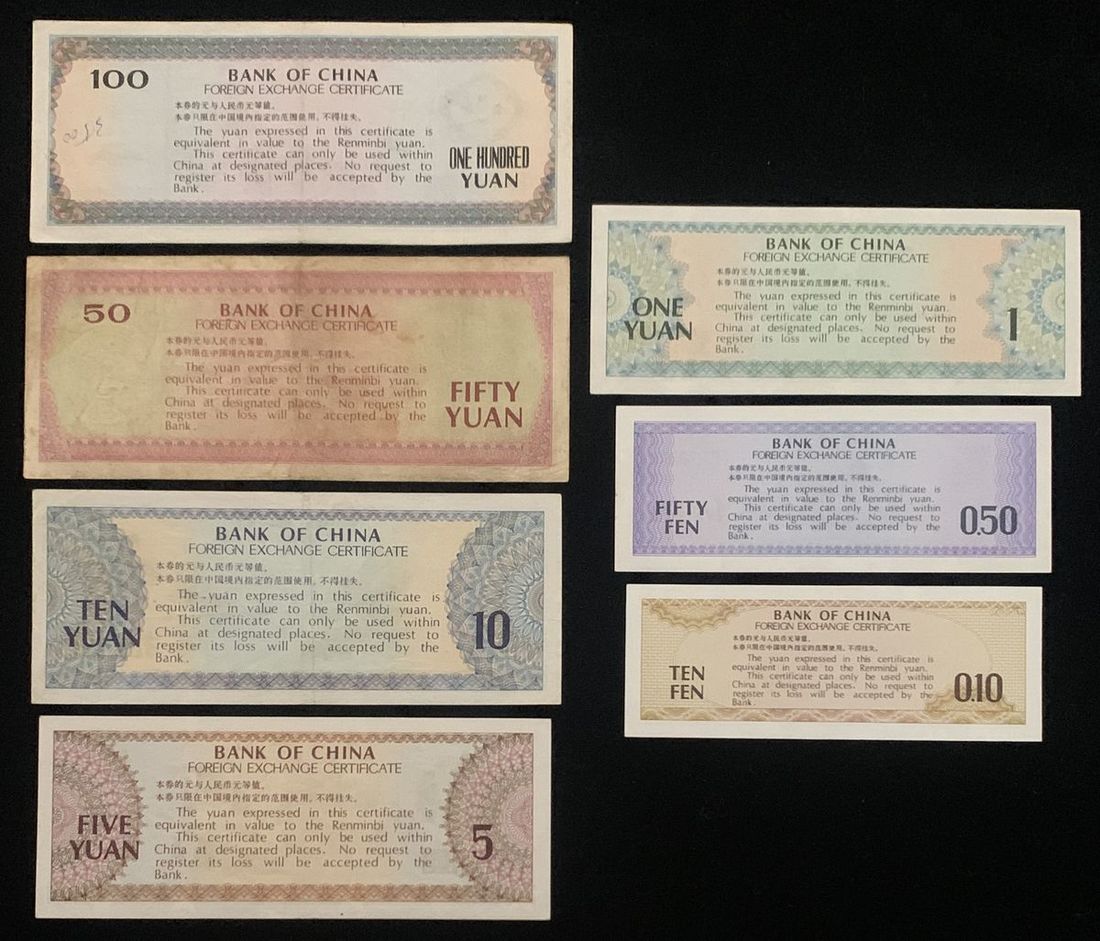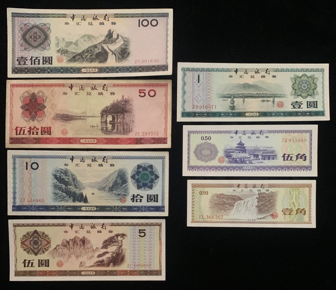 Foreign Exchange Certificate, Bank of China, a group of 7x, including 1 jiao to 100 yuan, 1979, serial numbers EL 366267, ZH 925089, ZN 916571, ZC 089807, ZT 536865, ZE 293282 and ZG 001630,