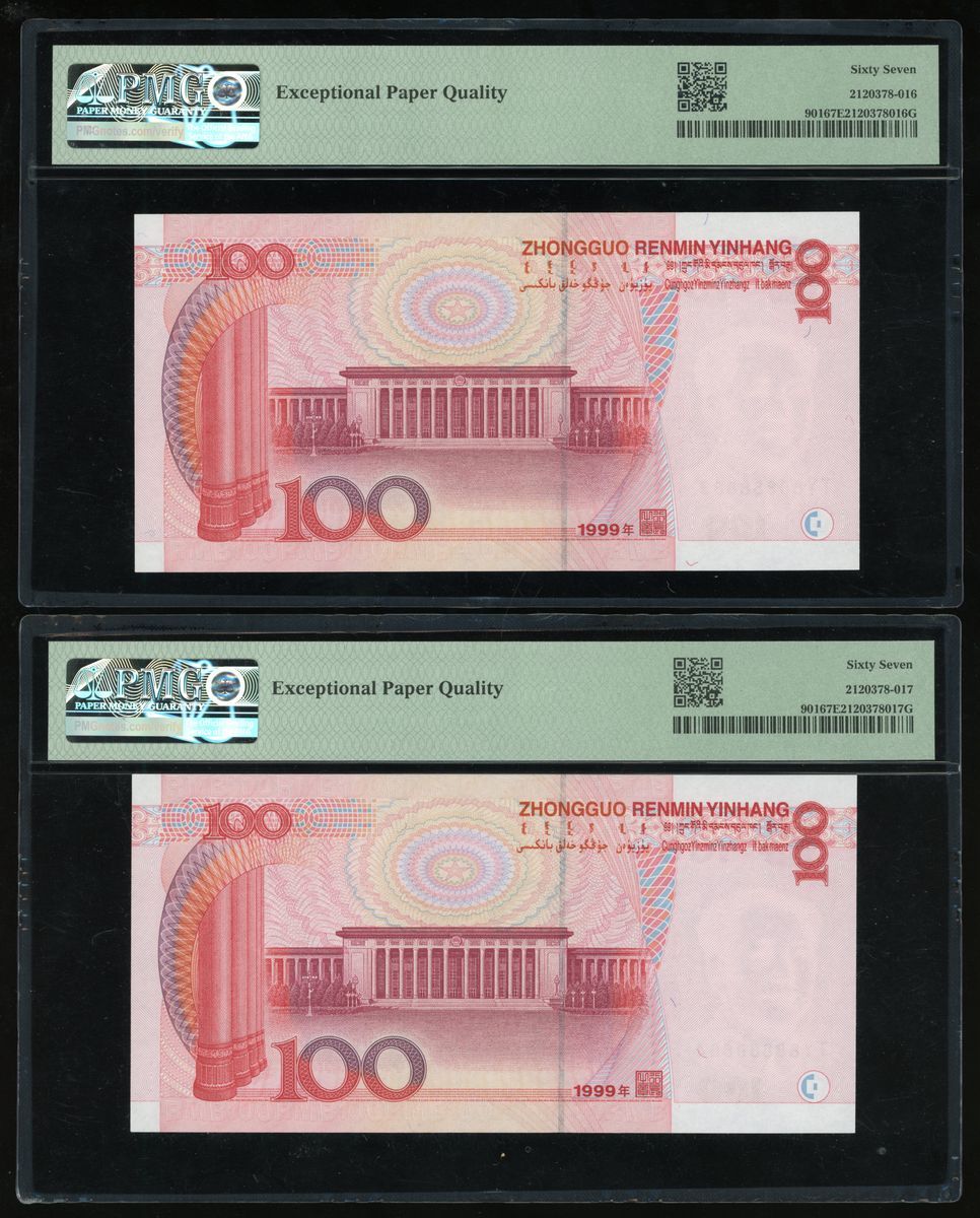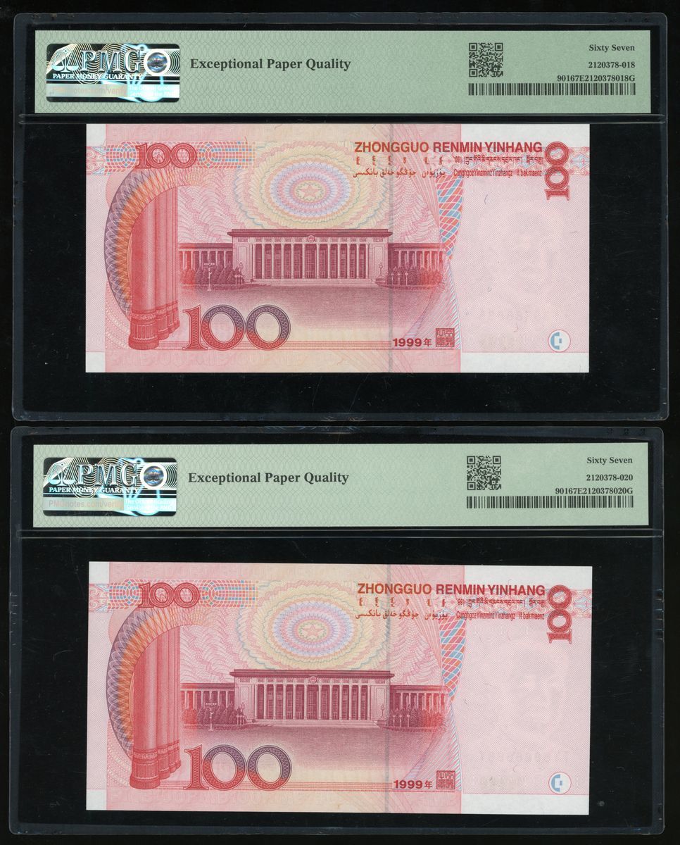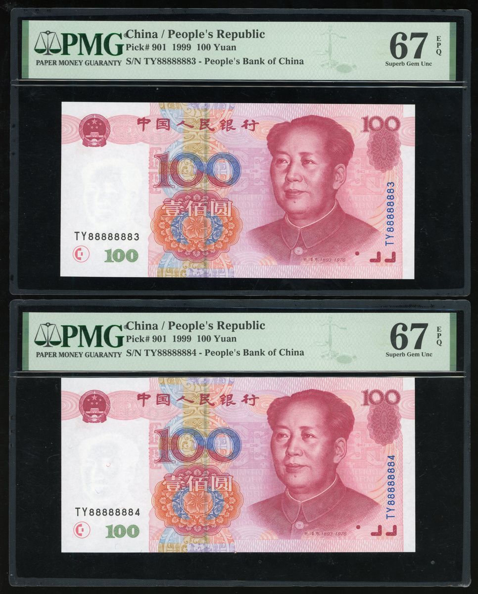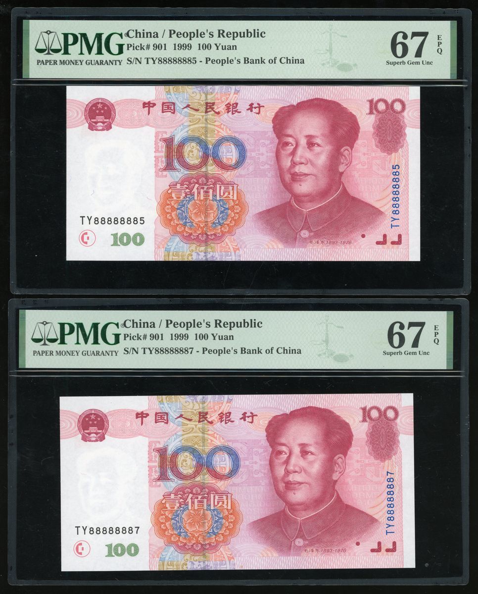 1999年中國人民銀行第五版人民幣壹佰圓,近乎全號TY 8888883、TY 88888884、TY 888888885和TY 88888887均PMG 67EPQ