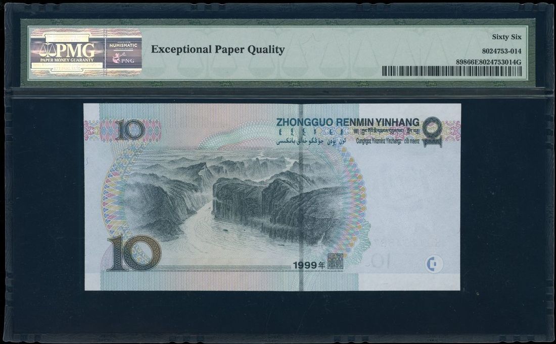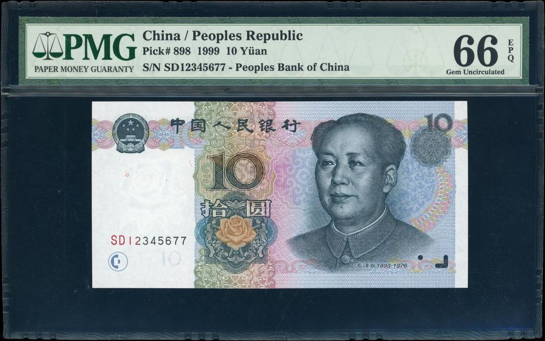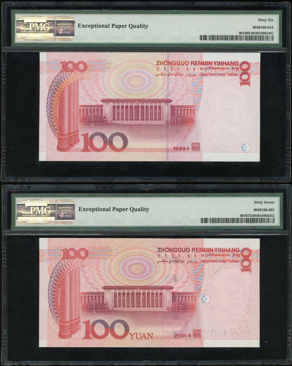 中國人民銀行趣味號一組3枚,包括1999年拾圓;1999年和2005年 壹佰圓,編號SD12345677、BR12345677和CG12345677,分別PMG 66EPQ、66EPQ和67EPQ和67EPQ