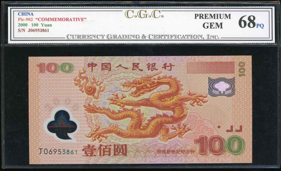2000年中國人民銀行千禧年紀念龍鈔壹佰圓,編號J06953861,CGC 68EPQ