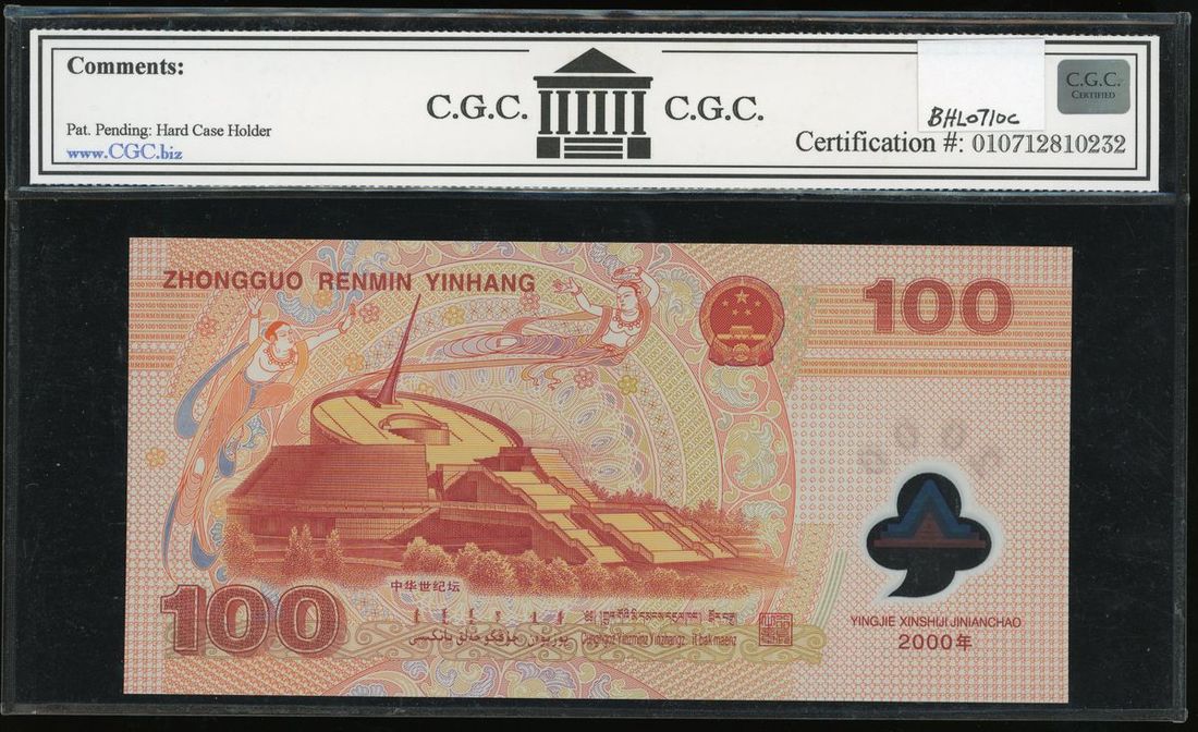 People's Bank of China, polymer commemorative 100 yuan, 2000, serial number J06953861, (Pick 902), CGC graded 68PQ.