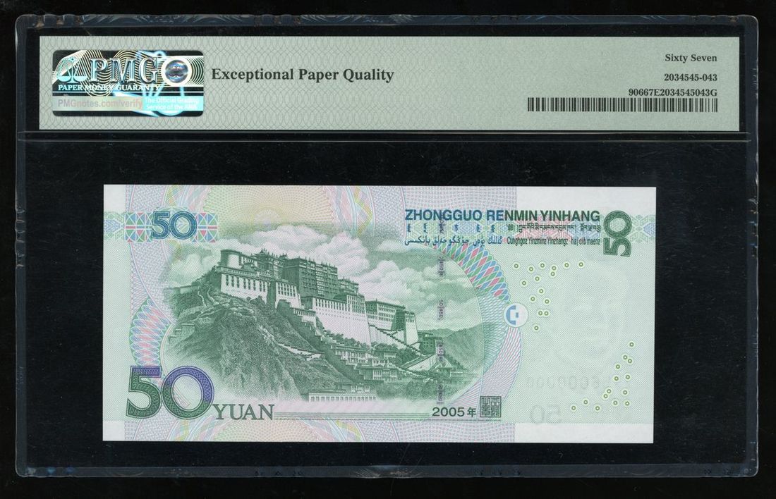 2005年中國人民銀行第五版人民幣伍拾圓,編號ZX56000000,PMG 67EPQ