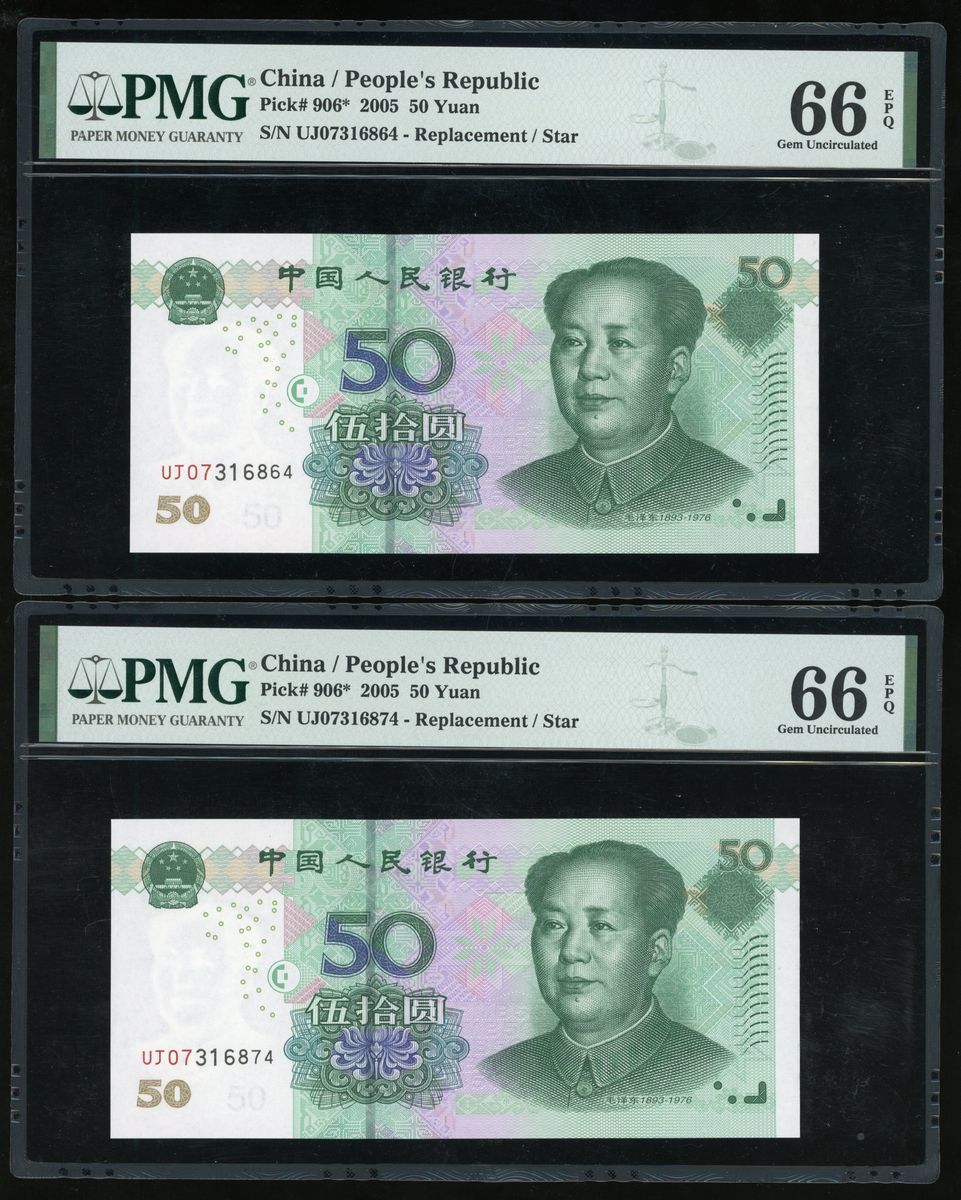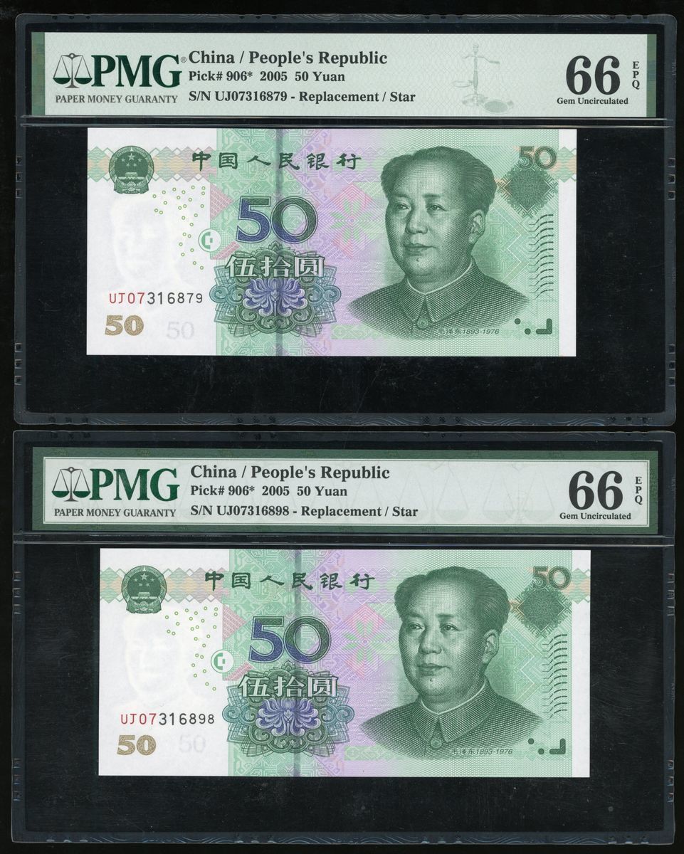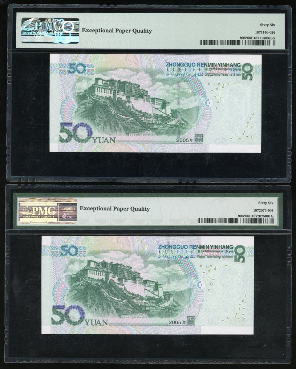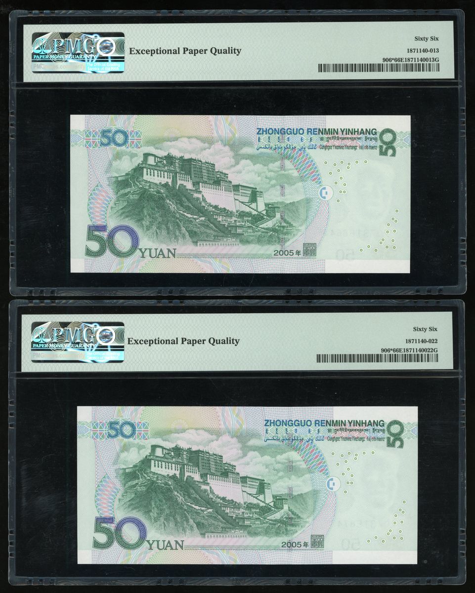 2005年中國人民銀行第五版人民幣伍拾圓補版一組4枚,編號UJ07 316879、UJ07 316864、UJ07 316874和UJ07 316898,均PMG 66EPQ