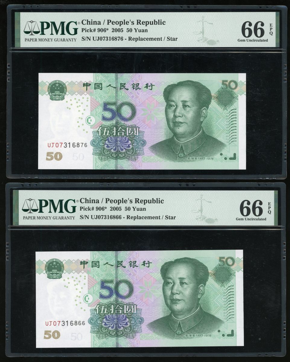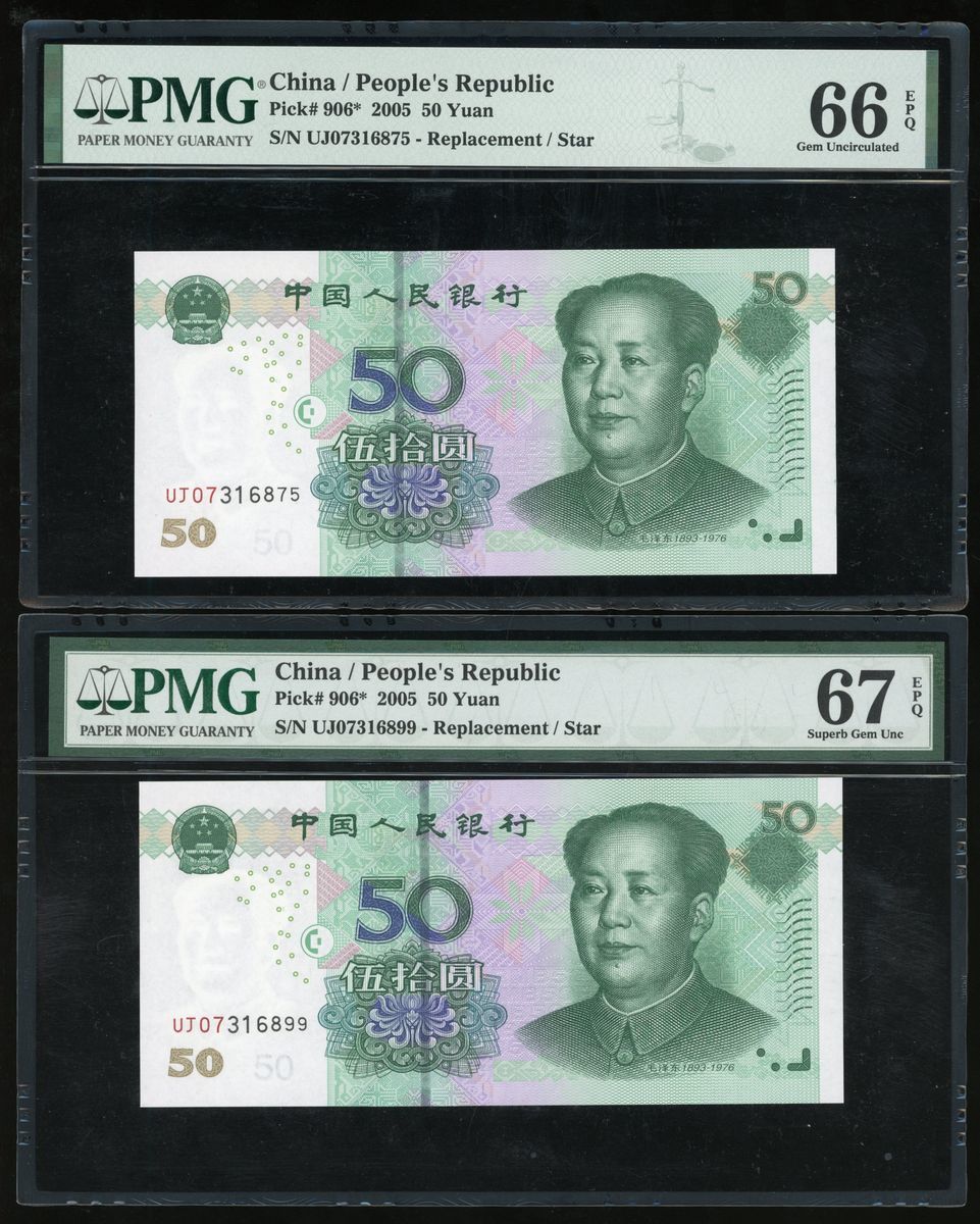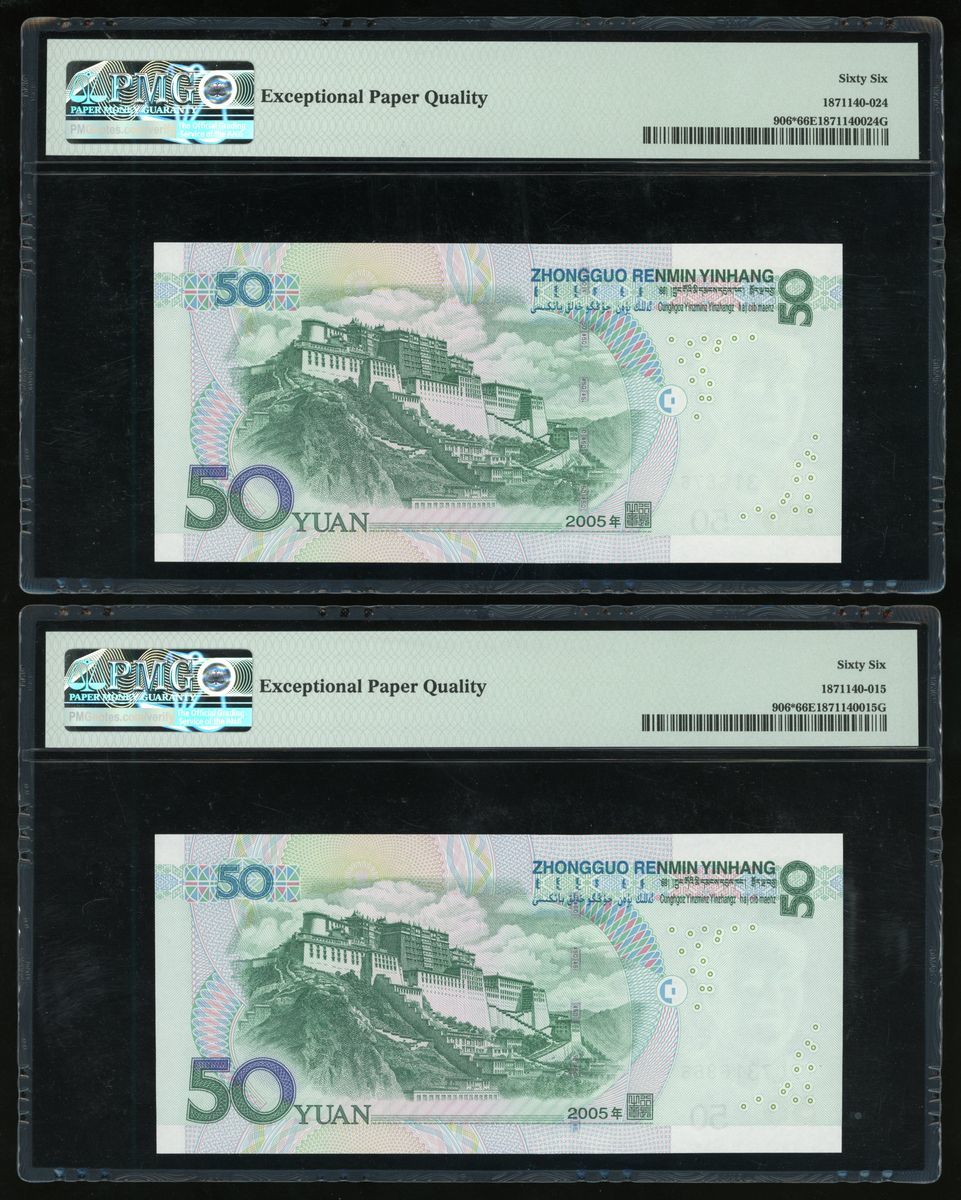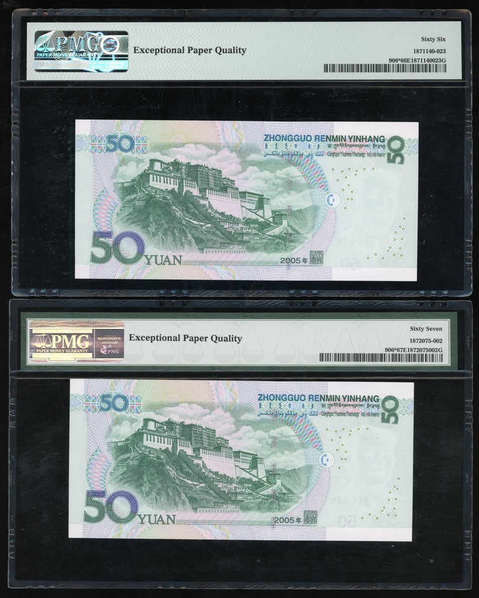 2005年中國人民銀行第五版人民幣伍拾圓補版一組4枚,編號UJ07 316876、UJ07 316866、UJ07 316899和UJ07 316875,一張評級為PMG 67EPQ,其餘66EPQ