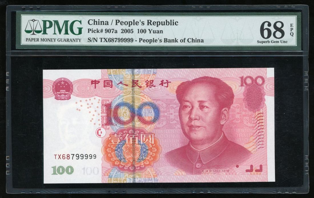 People's Bank of China, 5th series renminbi, 100 yuan, 2005, fancy serial number TX68 799999, (Pick 907a), PMG 68EPQ Superb Gem Uncirculated