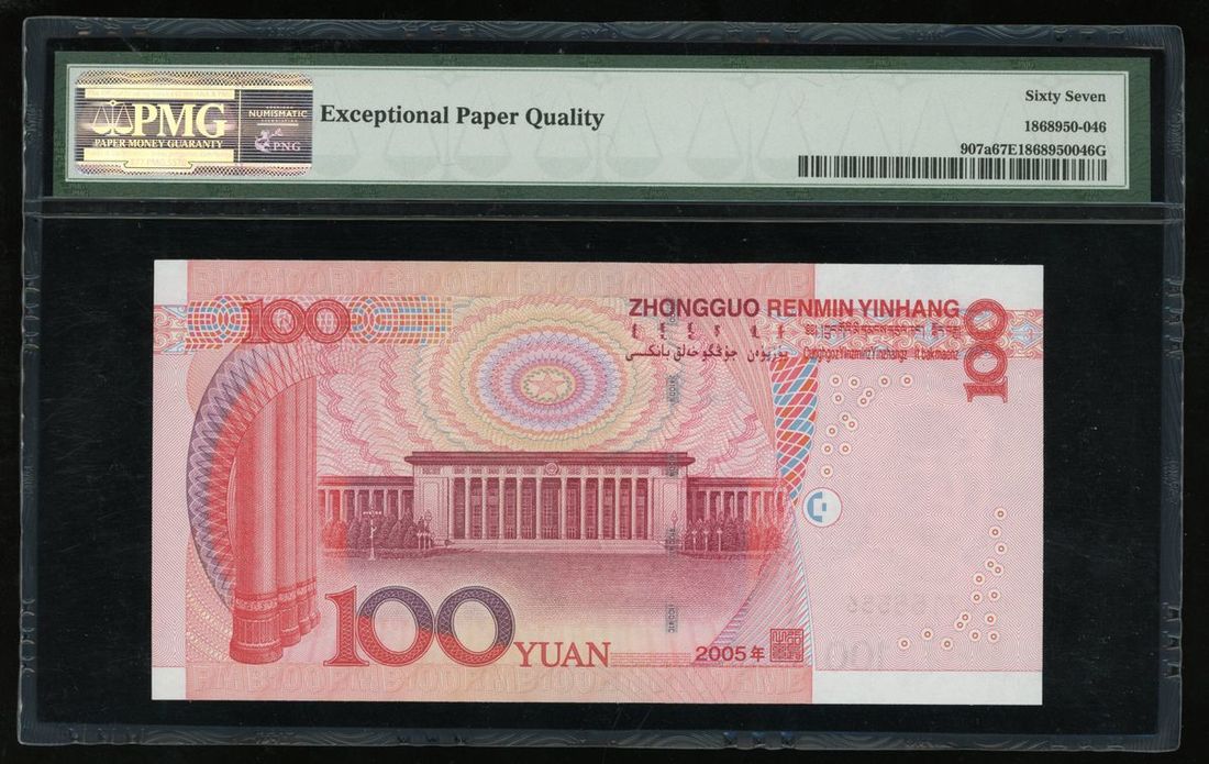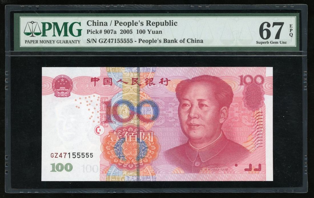People's Bank of China, 5th series renminbi, 100 yuan, 2005, fancy serial number GZ47 155555, (Pick 907a), PMG 67EPQ Superb Gem Uncirculated