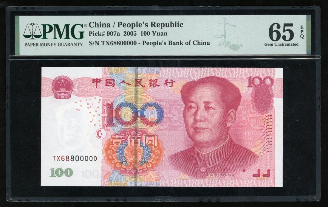 People's Bank of China, 5th series renminbi, 100 yuan, 2005, fancy serial number TX68 800000, (Pick 907a), PMG 65EPQ Gem Uncirculated