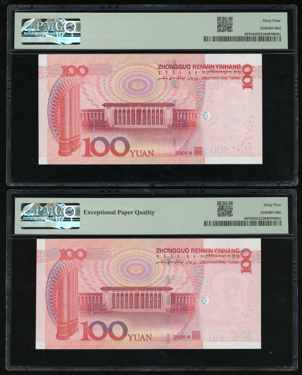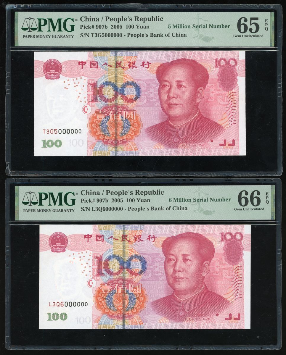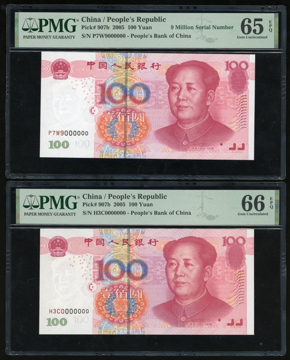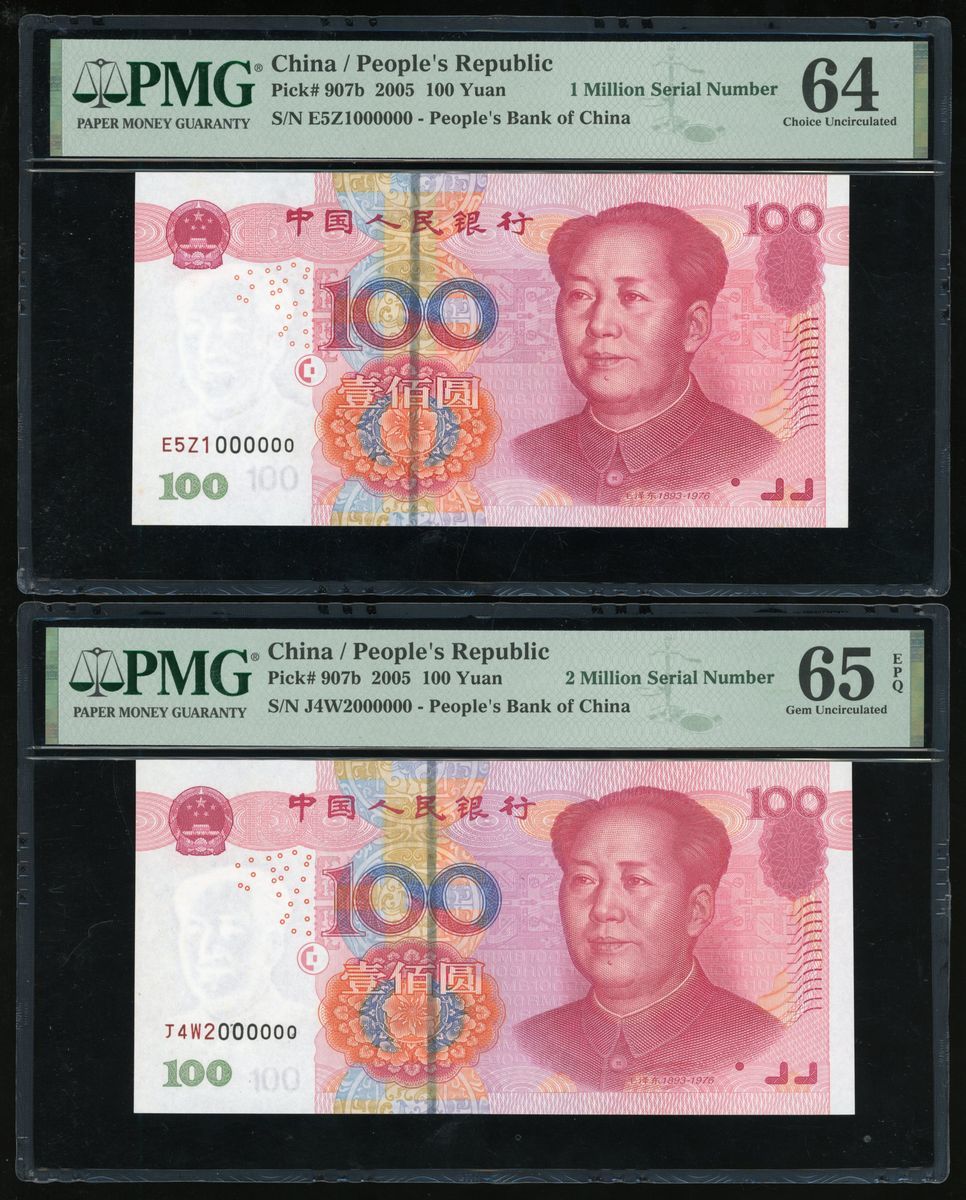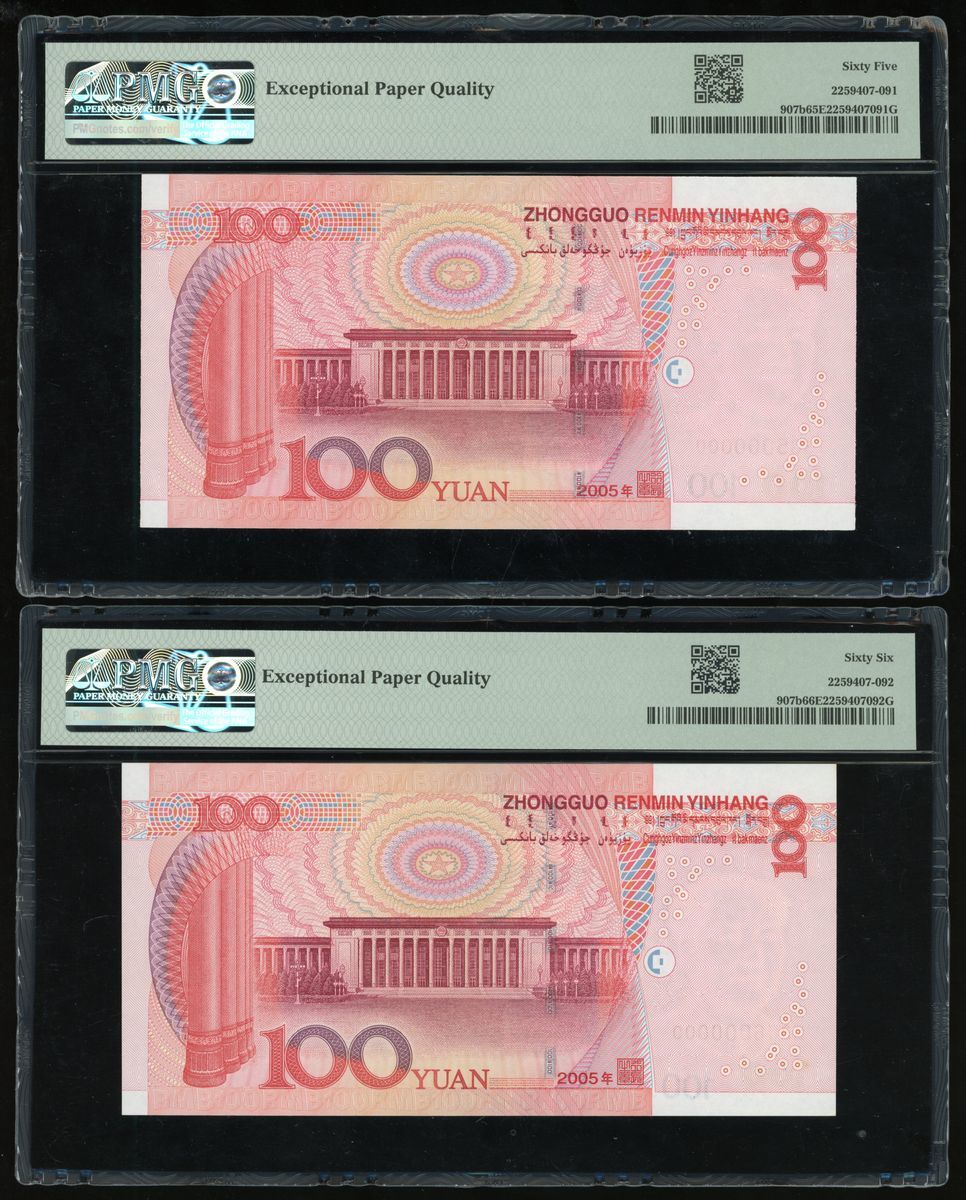 2005年中國人民銀行第五版人民幣壹佰圓一組10枚,2005年,全部幸運號000000,字軌E5Z1、J4W2、H6S3、P2P4、T3G5、L3Q6、E3Z7、G6P8、P7W9、H3C0b,分別PMG 64、65EPQ、66EPQ、66EPQ、65EPQ、66EPQ、64、64EPQ、65EPQ、66EPQ