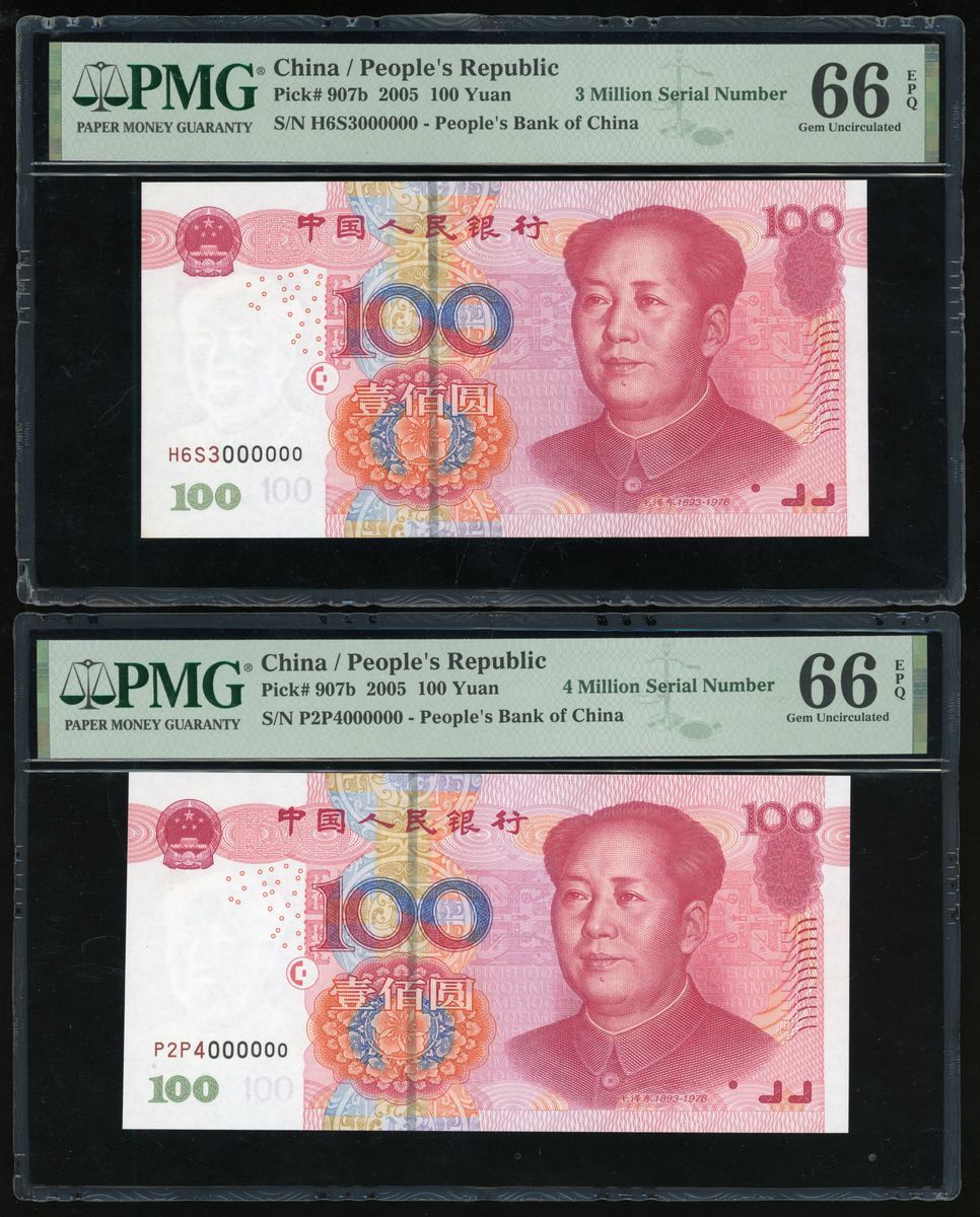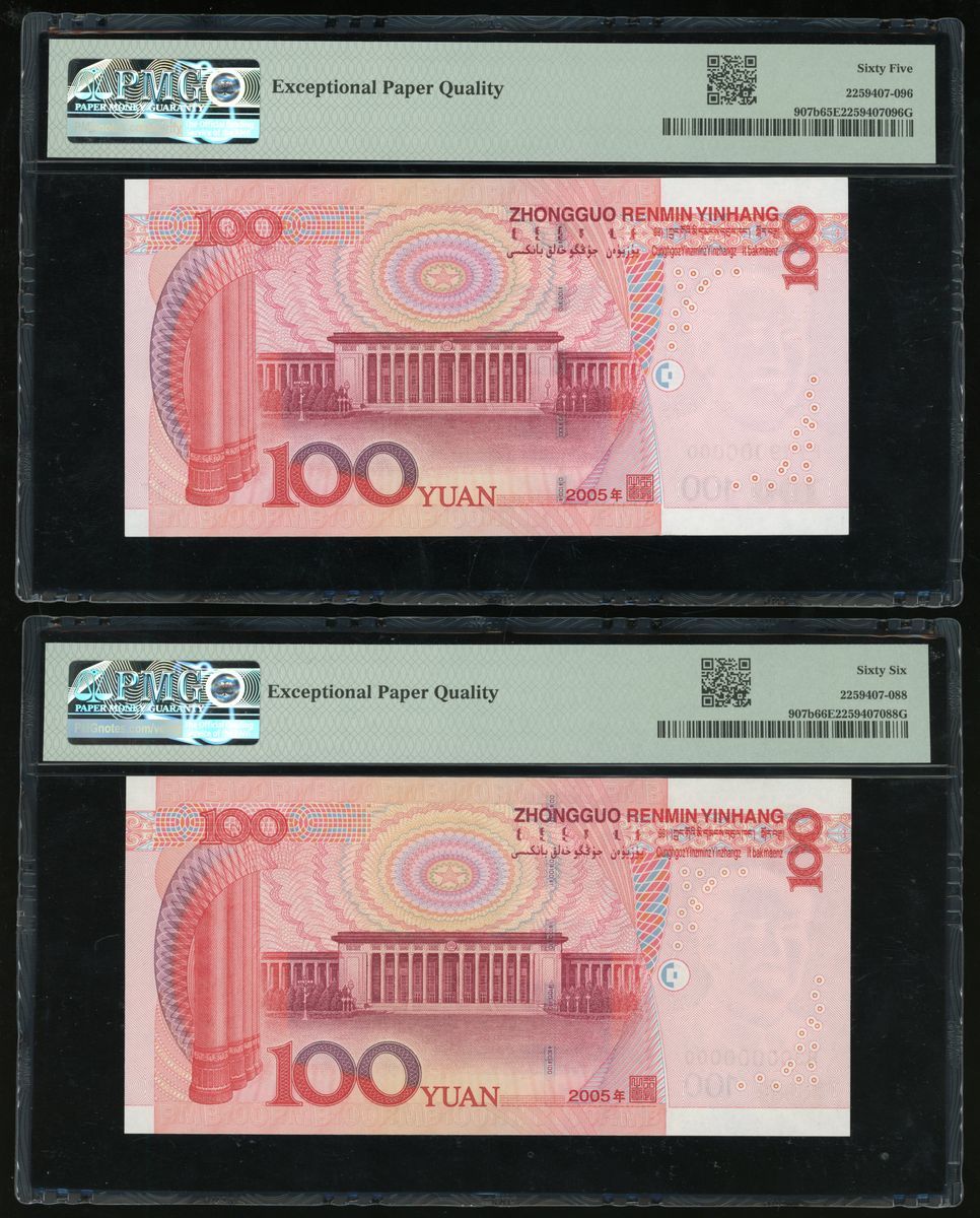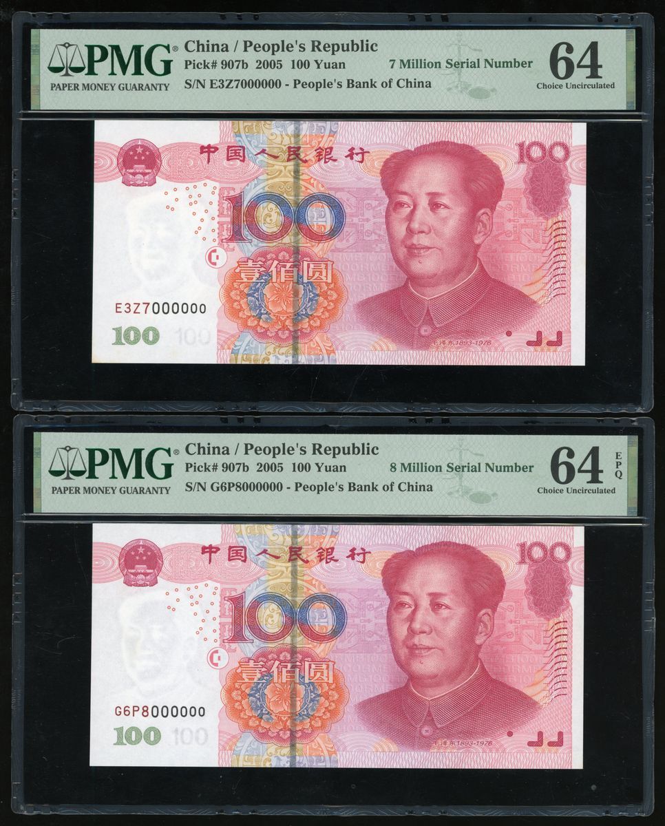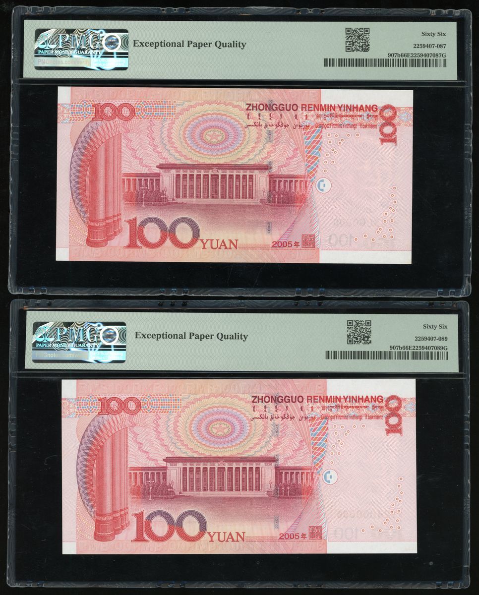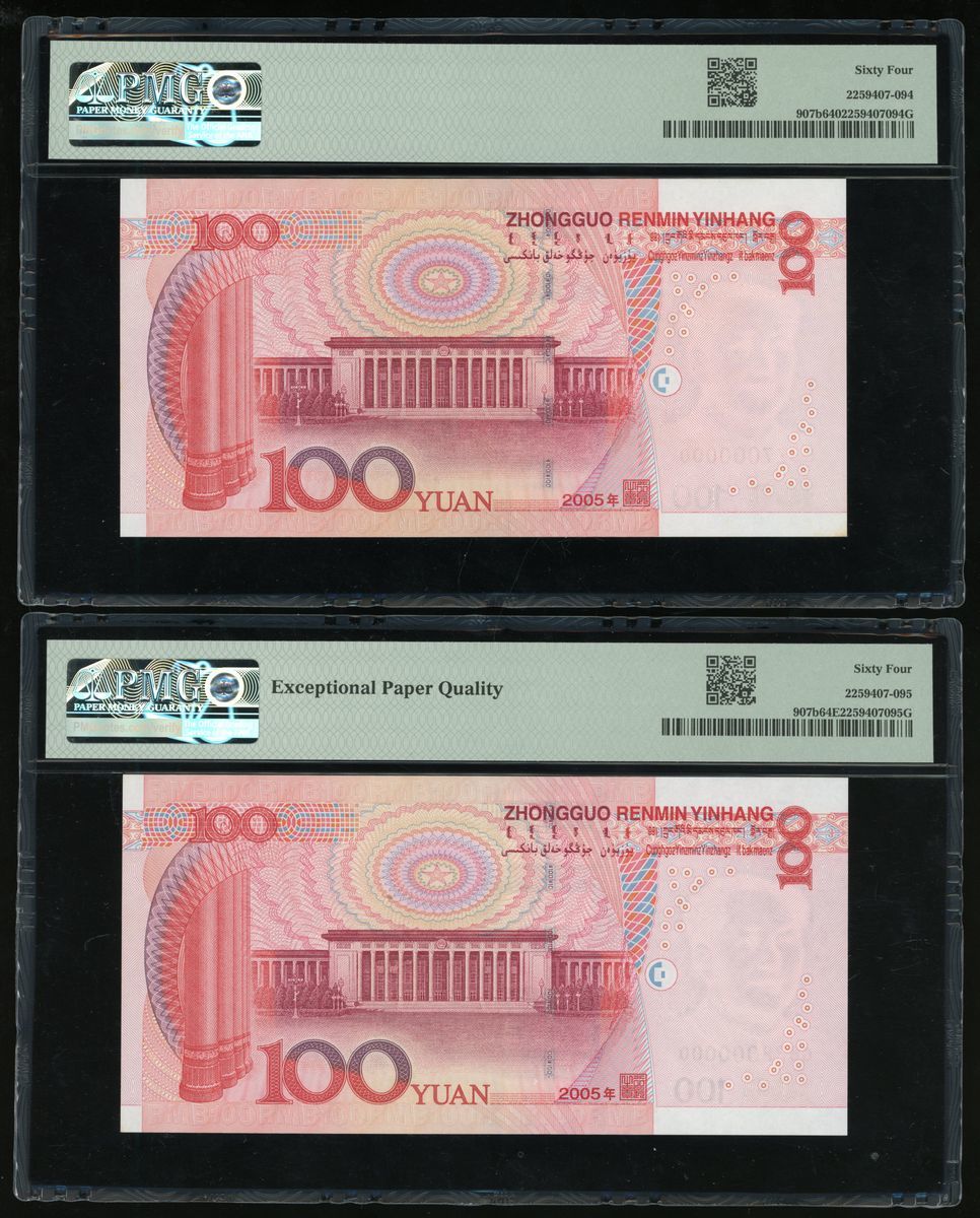 2005年中國人民銀行第五版人民幣壹佰圓一組10枚,2005年,全部幸運號000000,字軌E5Z1、J4W2、H6S3、P2P4、T3G5、L3Q6、E3Z7、G6P8、P7W9、H3C0b,分別PMG 64、65EPQ、66EPQ、66EPQ、65EPQ、66EPQ、64、64EPQ、65EPQ、66EPQ
