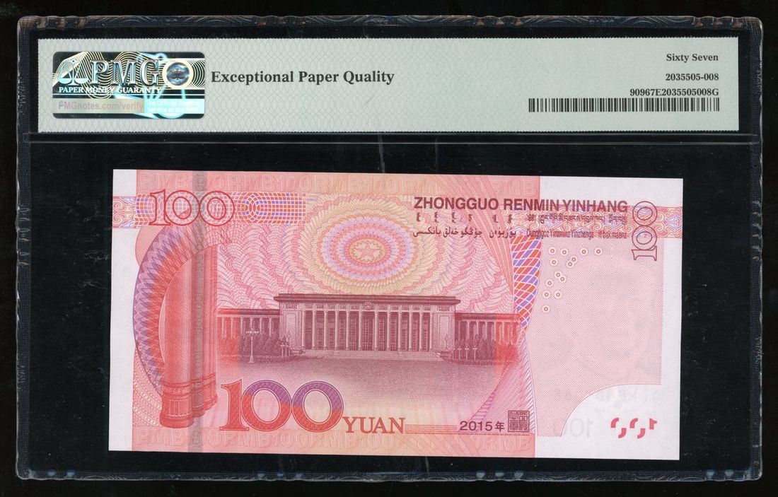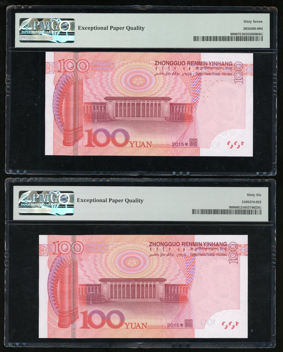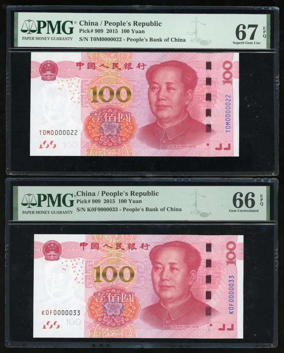 2015年中國人民銀行第五版人民幣壹佰圓一組3枚,細編號K0F0 000033、T0M0 000022 和T0M0 000068,分別PMG 66EPQ 、67EPQ及67EPQ