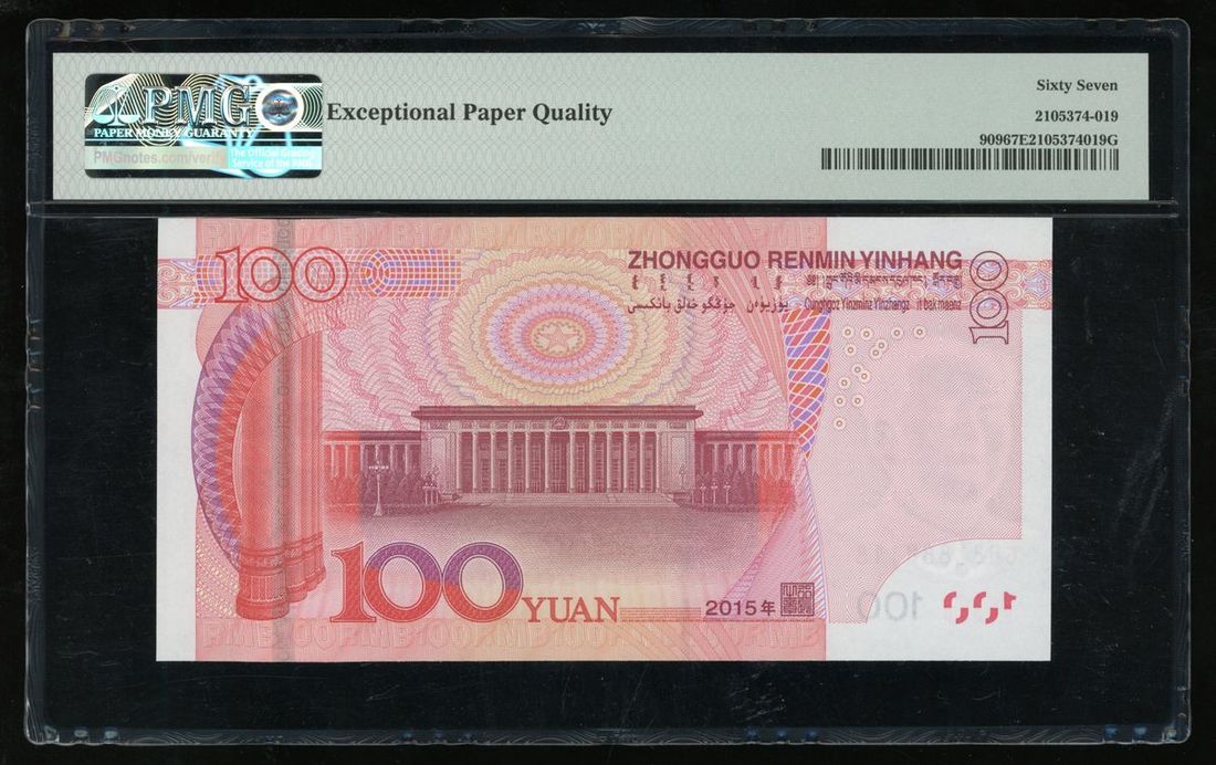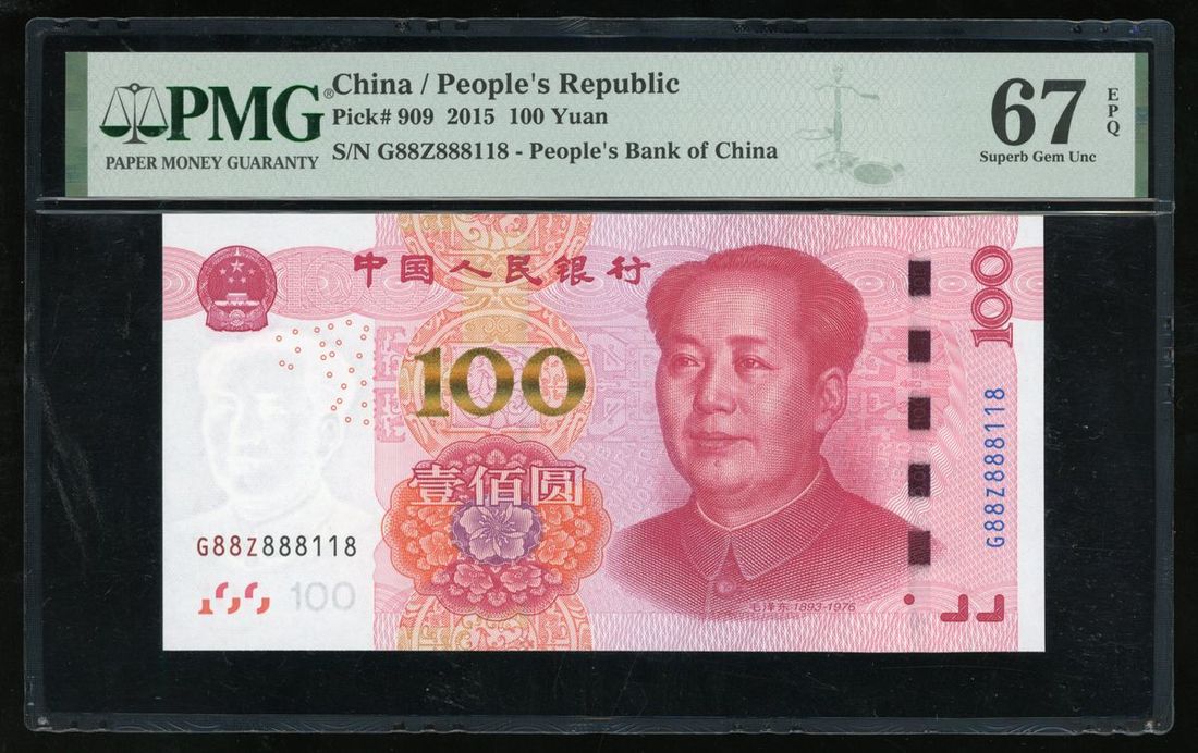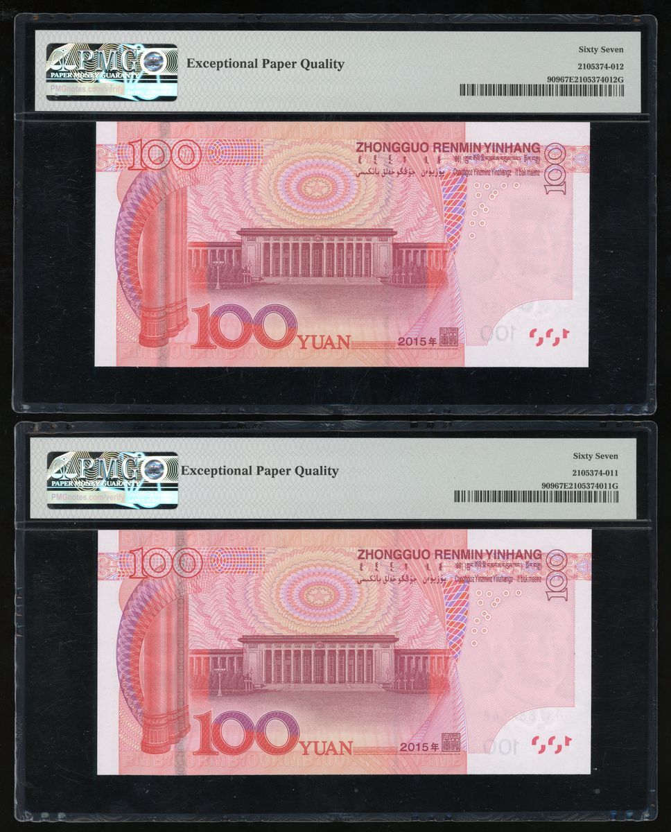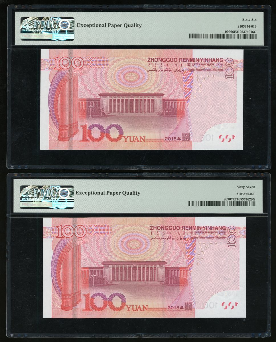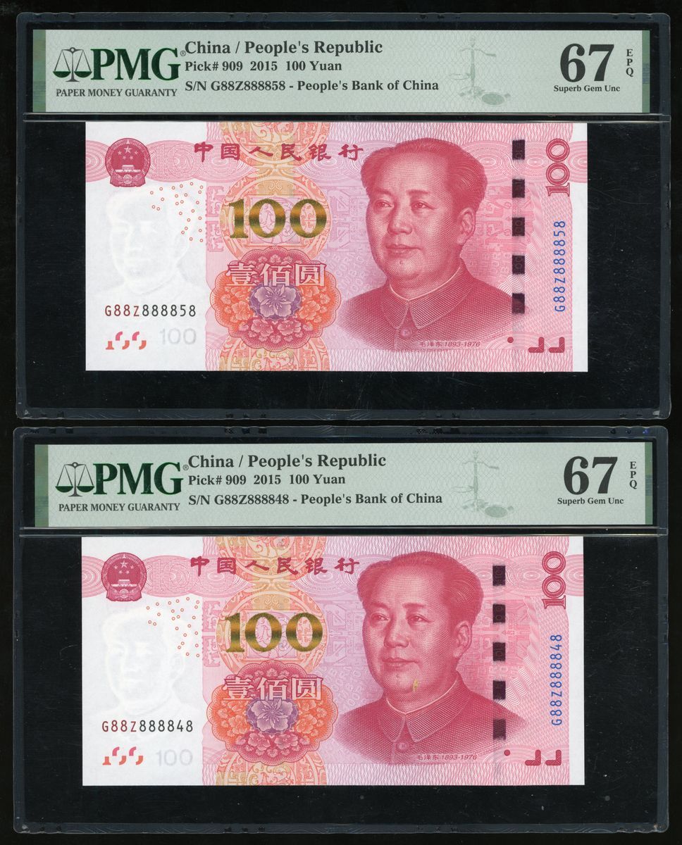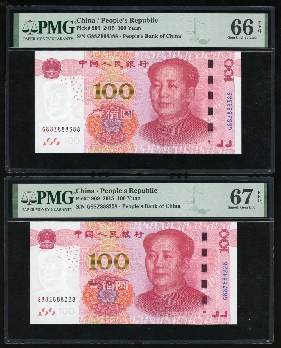 015年中國人民銀行第五版人民幣壹佰圓一組5枚,趣味號888858、888848、888388、888228、888118,均帶有前綴G88Z,888388評PMG 66EPQ,其餘 67EPQ Superb Gem