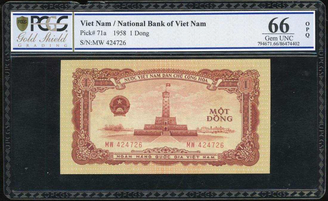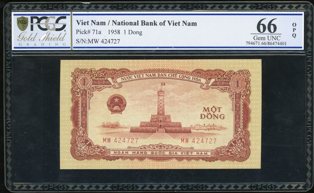 National Bank of Vietnam, consecutive pair of 1 dong, 1958, serial numbers MW424726/424747, (Pick 71a), PMG 66OPQ gem UNC (2)