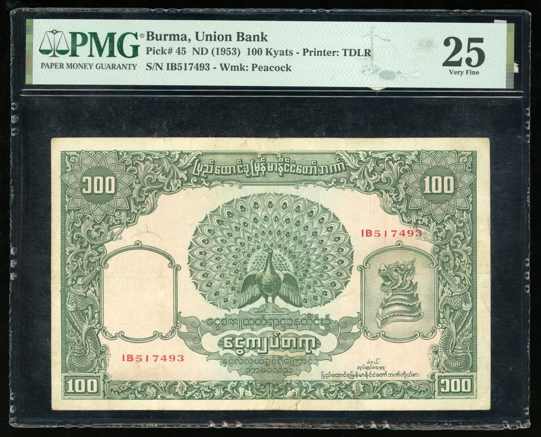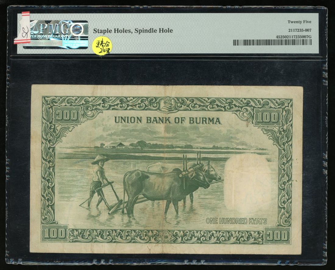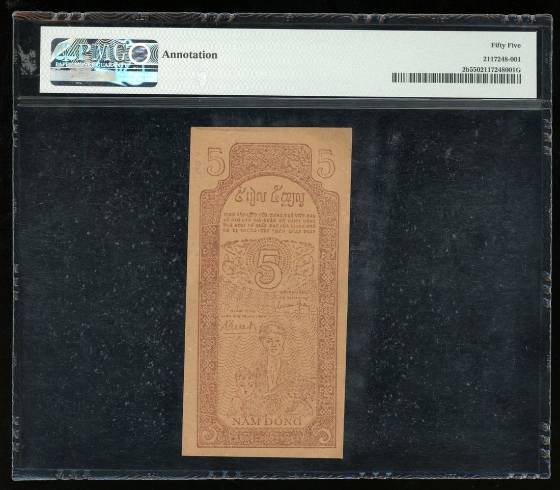 Asia Banknotes, including Burma 100 kyats (1953) and Vietnam 5 dong (1946), (Pick 45, 2b), PMG 25, staple holes, spindle hole and PMG 55, annotation respectively (2)