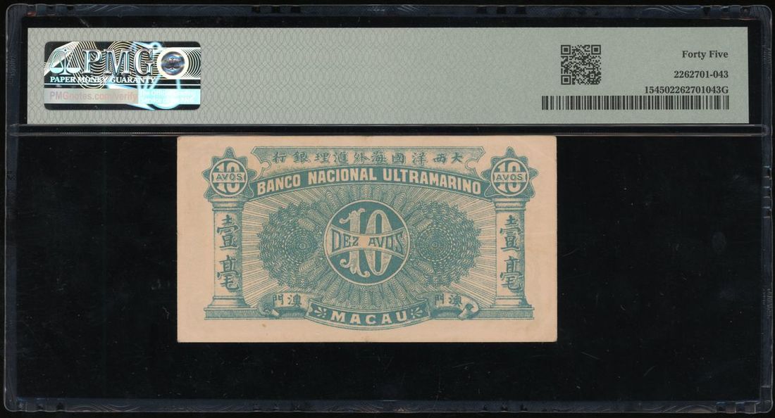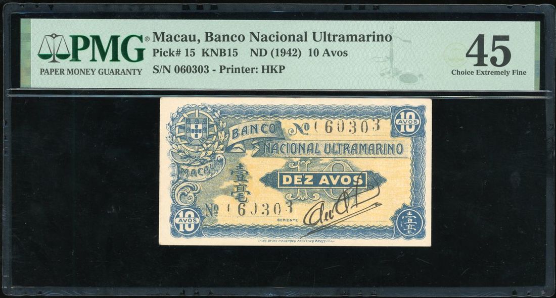 Banco Nacional Ultramarino, Macau, 10 avos, ND (1942), serial number 060303, (Pick 15), PMG 45 Choice Extremely Fine