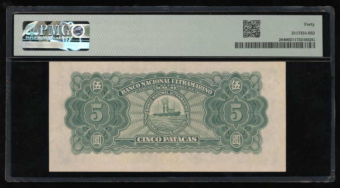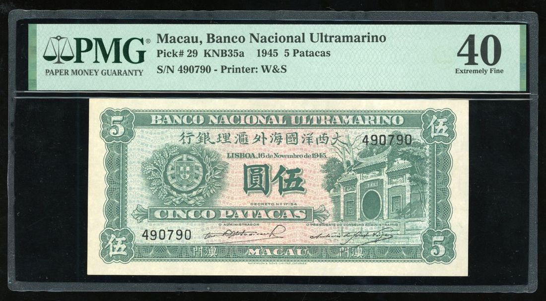 Banco Nacional Ultramarino, Macau, 5 patacas, 1945, serial number 490790, (Pick 29), PMG 40 Extremely Fine.