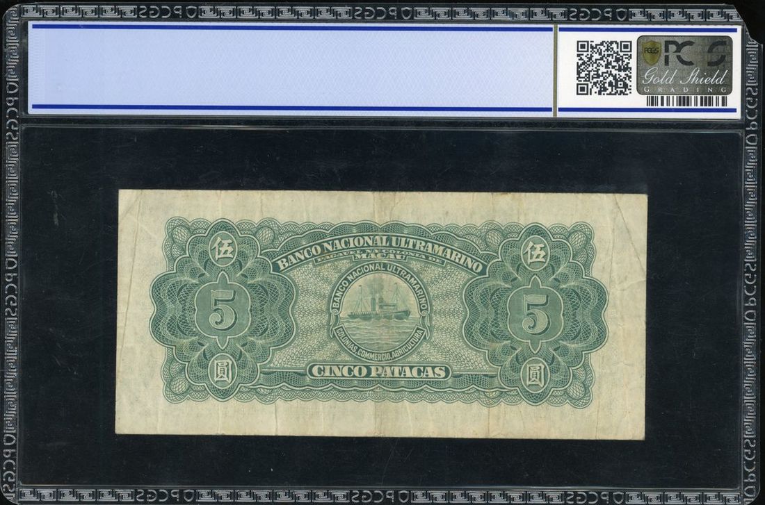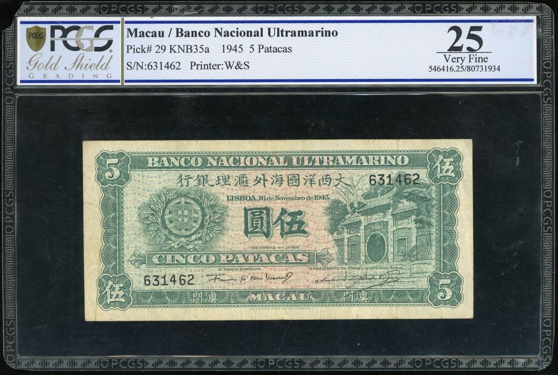 Banco Nacional Ultramarino, Macau, 5 patacas, 1945, serial number 631462, (Pick 29), PCGS 25 very fine. Note top left corner of holder chipped, does not affect note itself.