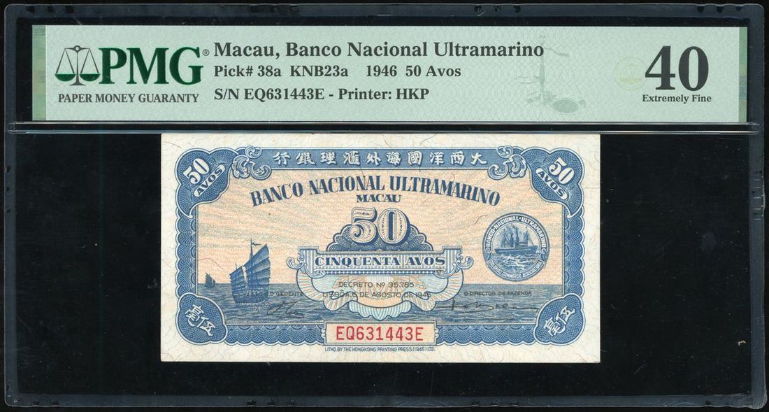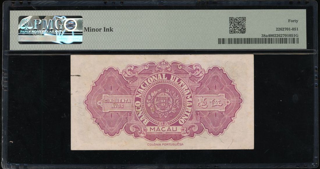Banco Nacional Ultramarino, Macau, 50 avos, 1946, serial number EQ 631443E, (Pick 38a), PMG 40 Extremely Fine (Minor Ink)