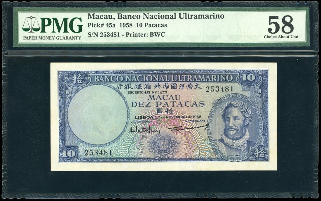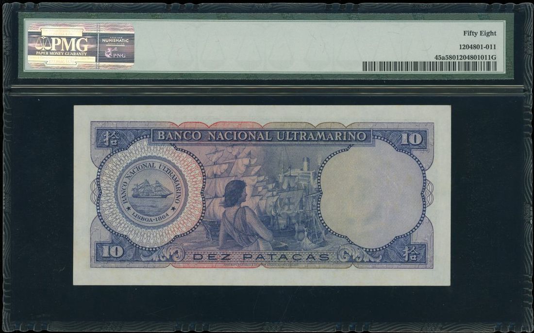 Banco Nacional Ultramarino, Macau, 10 patacas, 20.11.1958, serial number 253481, (Pick 45a), PMG 58 choice about unc