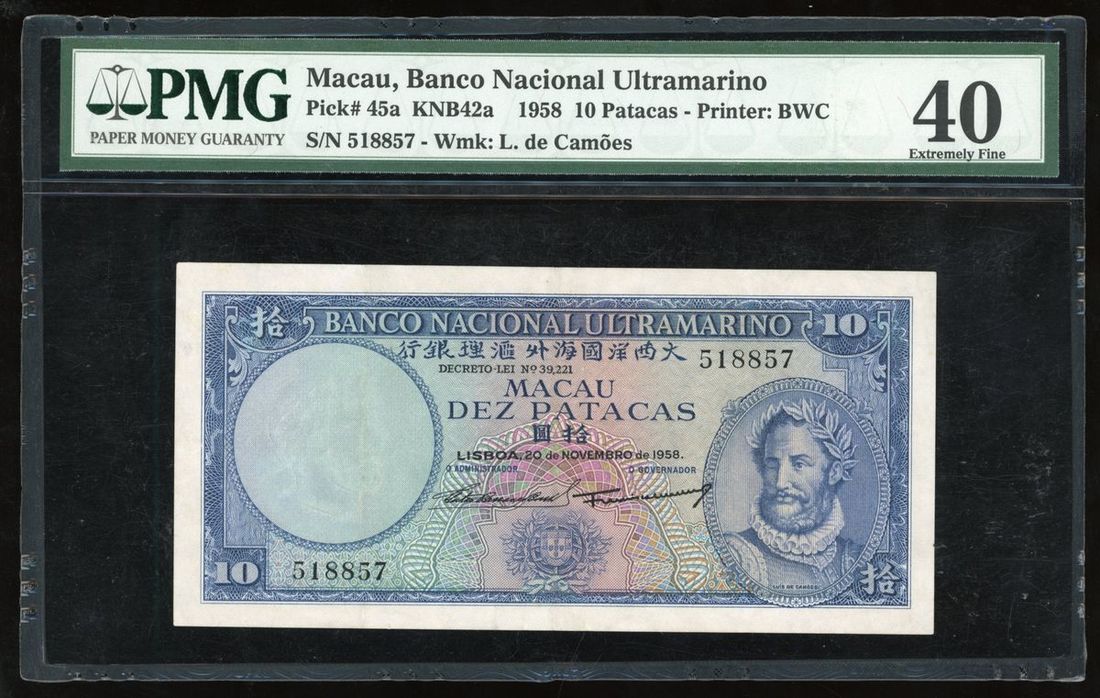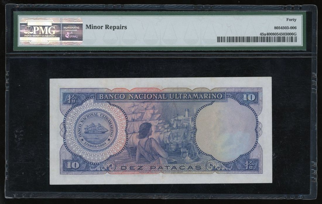 Banco Nacional Ultramarino, Macau, 10 patacas, 20.10.1958, serial number 518857, (Pick 45a), PMG 40 extremely fine, minor repairs