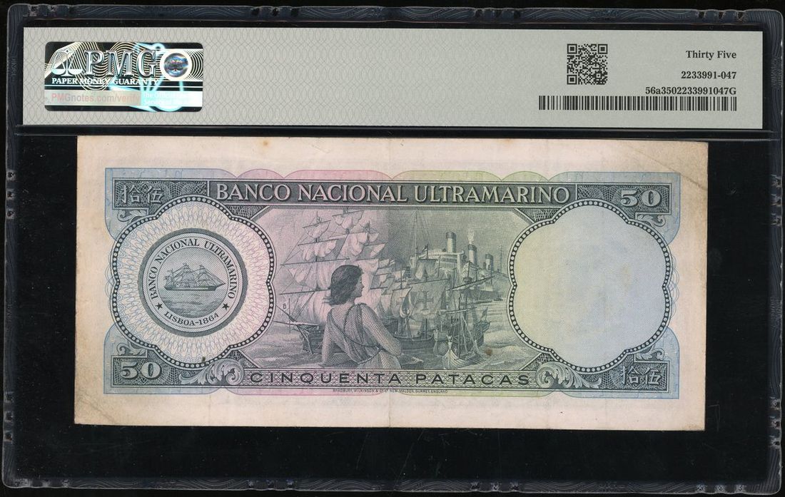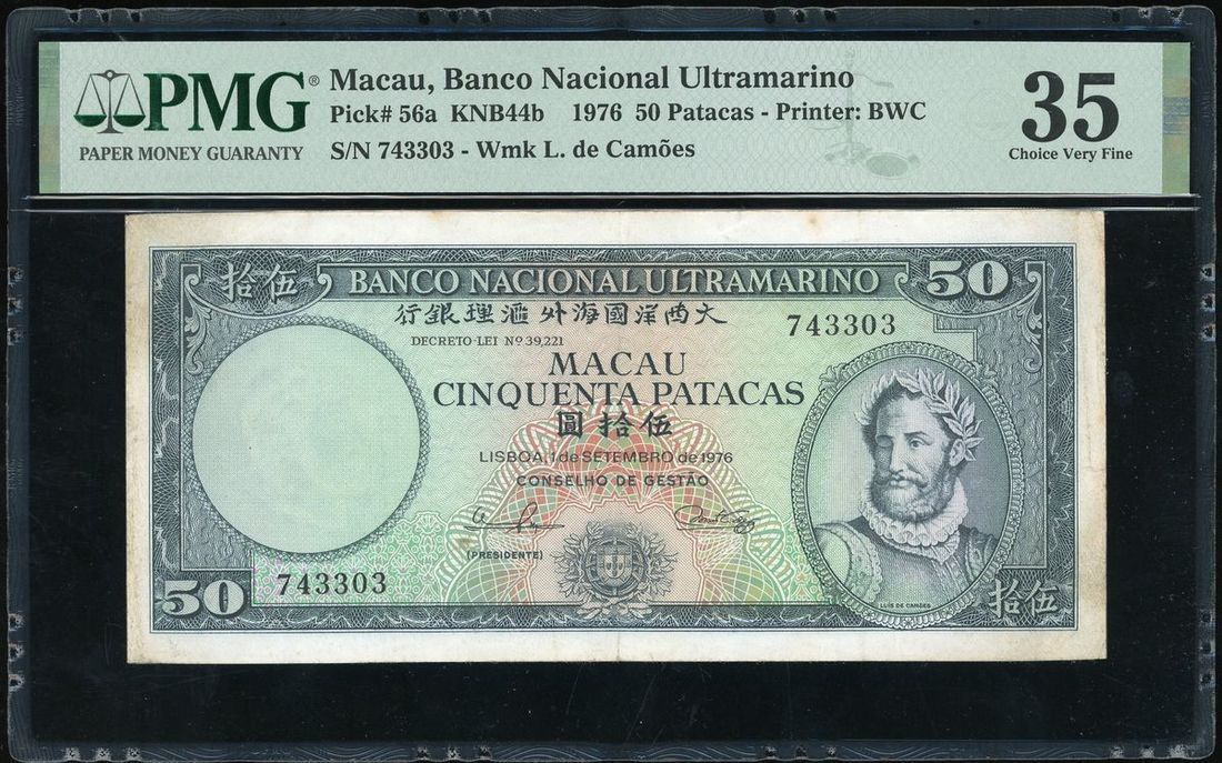 Banco Nacional Ultramarino, Macau, 50 patacas, 1976, serial number 743303, (Pick 56a), PMG 35 Choice Very Fine