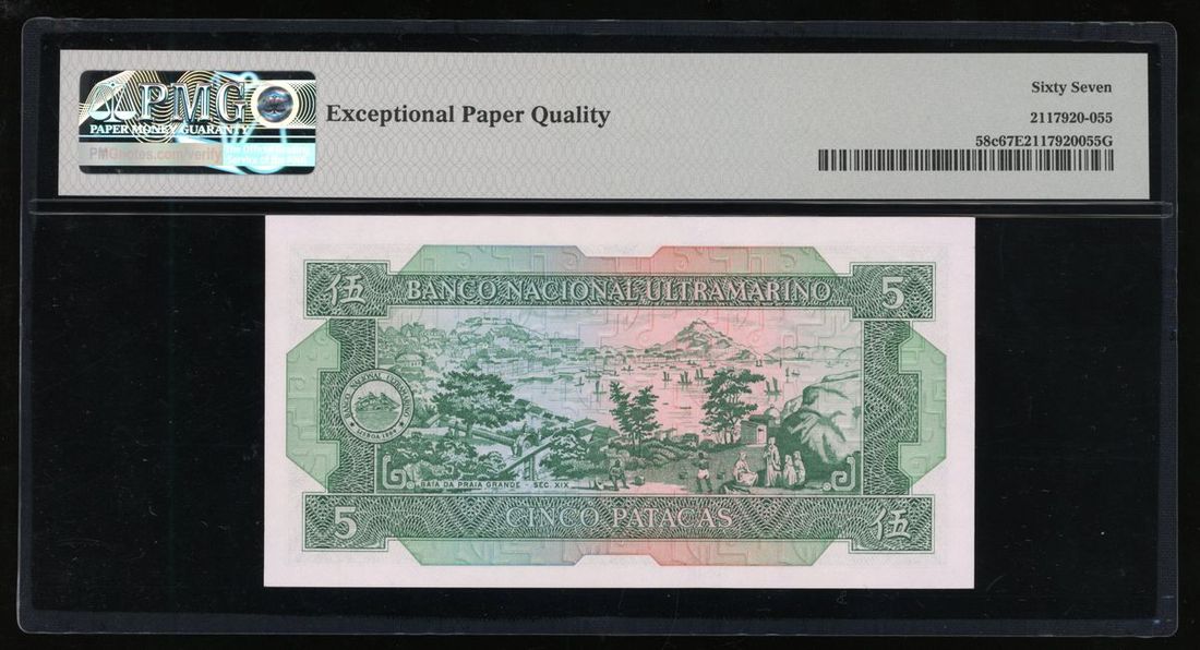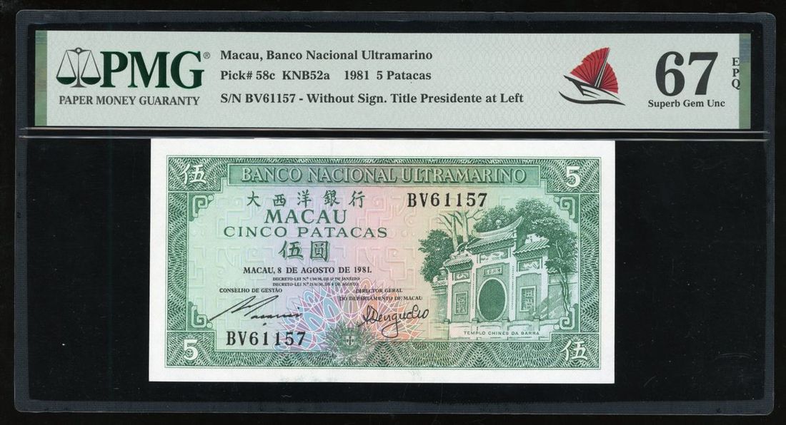 Banco Nacional Ultramarino, Macau, 5 patacas, 1981, serial number BV61157, (Pick 58c), PMG 67EPQ.