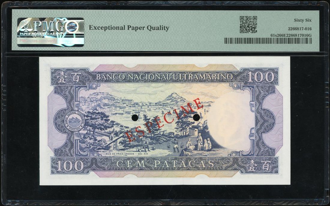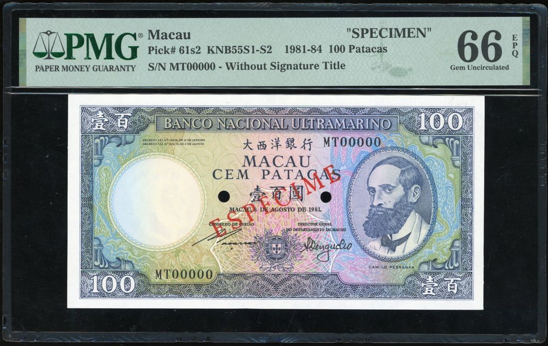 Banco Nacional Ultramarino, Macau, specimen 100 patacas, 8.8.1981, serial number MT00000, (Pick 60s2), PMG 66EPQ gem uncirculated