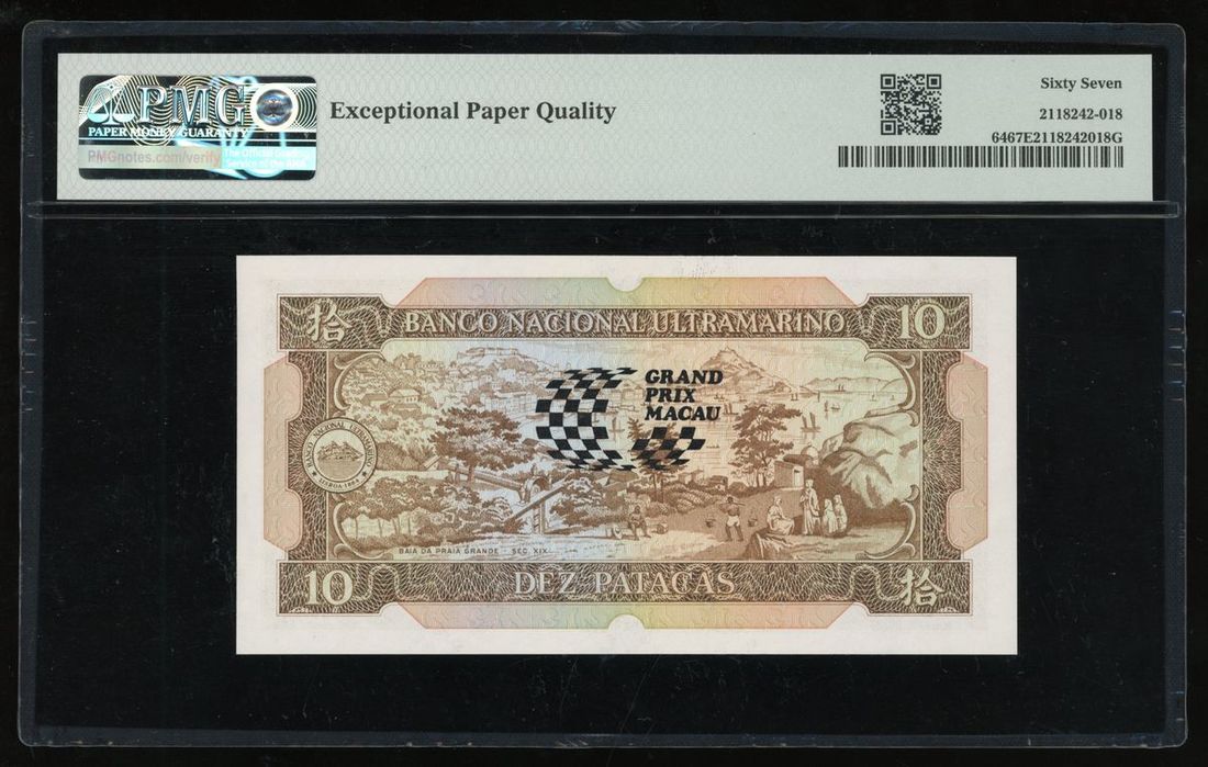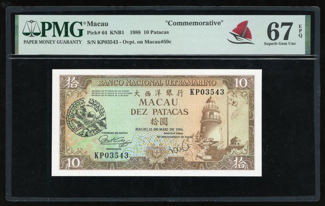 Banco Nacional Ultramarino, Macau, 10 patacas, 1988 commemorative issue overprinted on 1984 issue, serial number KP03543, (Pick 64), PMG 67EPQ.