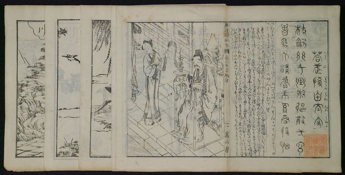 1850s a total of fifteen leaflets of Chinese Tang poems and illustrations printed on woodblock prints from the late Edo period in Japan, each size: 22.5x30cm