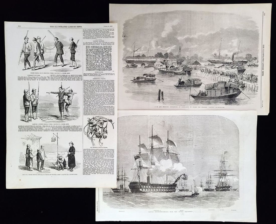 1857-1858"The Illustrated London News (倫敦畫報)" 刊印的三版插圖; 包括1. 第二次鴉片戰爭中受傷的英兵在香港登上廣州號醫療船之情況; 2. 派往中國的英國增援艦隊; 3. 描繪中國處理罪犯的三種方法. 所有插圖都是木刻畫, 保存良好.