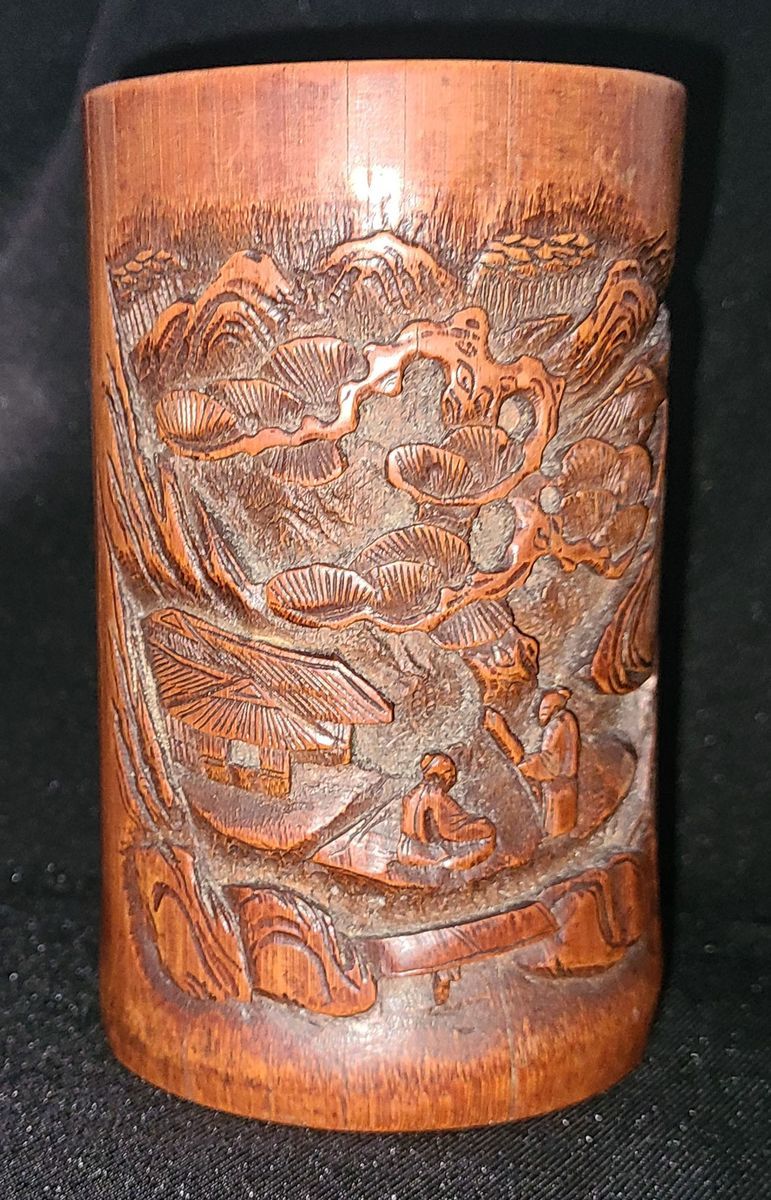 1950s-1960s "Two Old Men Under the Pine Tree" bamboo carving pen holder, height 12.5cm, diameter 7.5cm