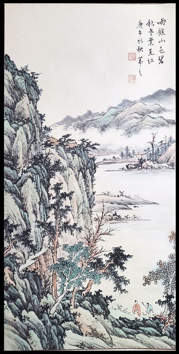 1990年顧茀之山水畫立軸, 紙本設色, 鈐印兩枚: 顧 (白文, 茀之 (朱文). 畫幅尺寸:34.5x67.5cm