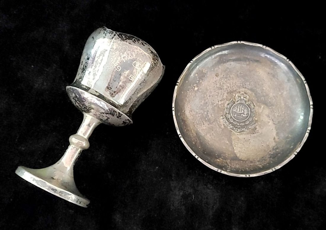 1938年皇仁書院小銀杯 (40g) 及皇家香港員警紀念小銀碟 (53g, 直徑8.5cm)各一件.