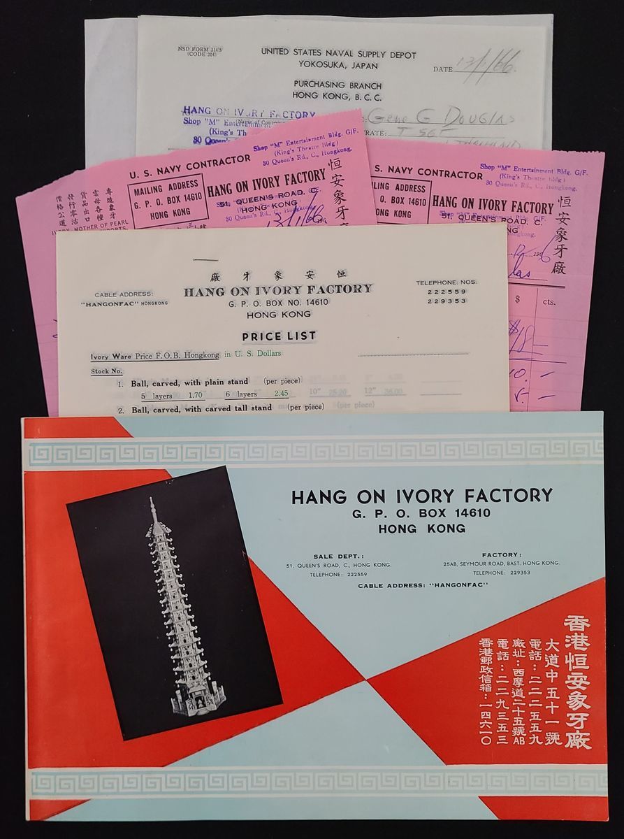 1960s Hong Kong Hang On Ivory Factory product catalog and price list, plus few copy of trade documents.