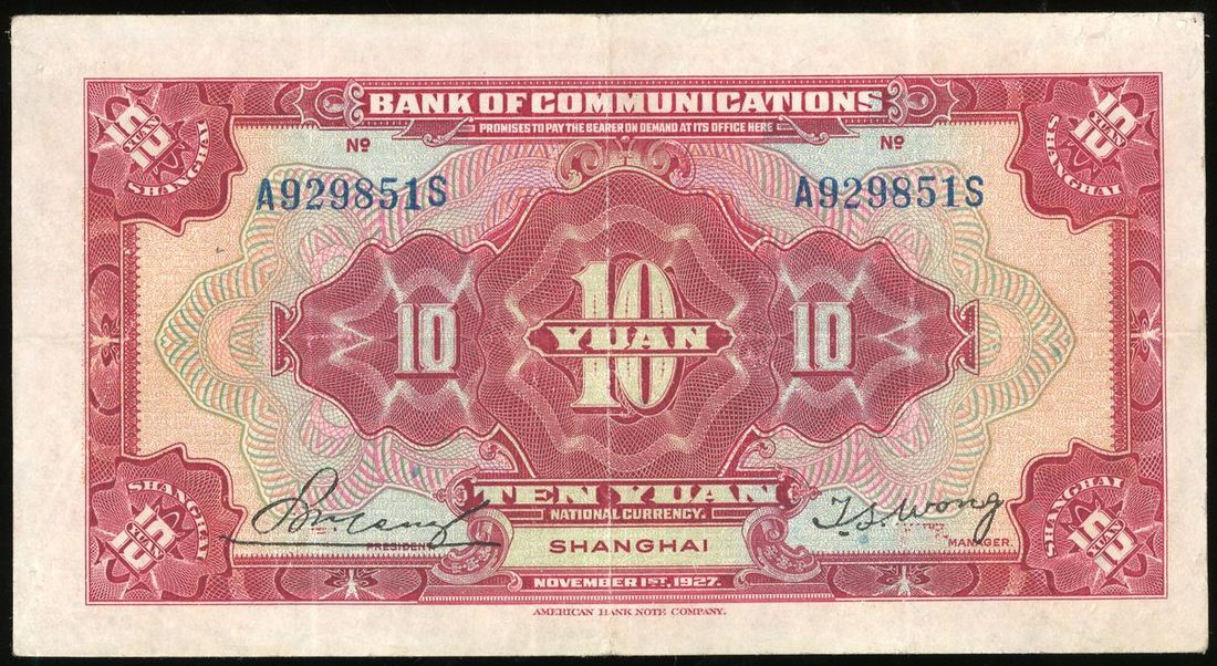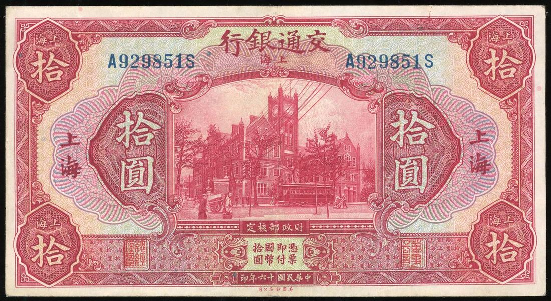 Bank of Communications, China, 10 yuan, Shanghai, Year 16 (1927), serial number A929851S, (Pick 147A), pressed, about extremely fine