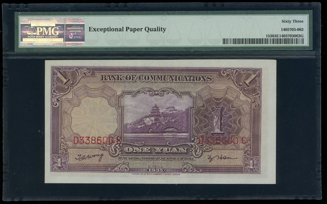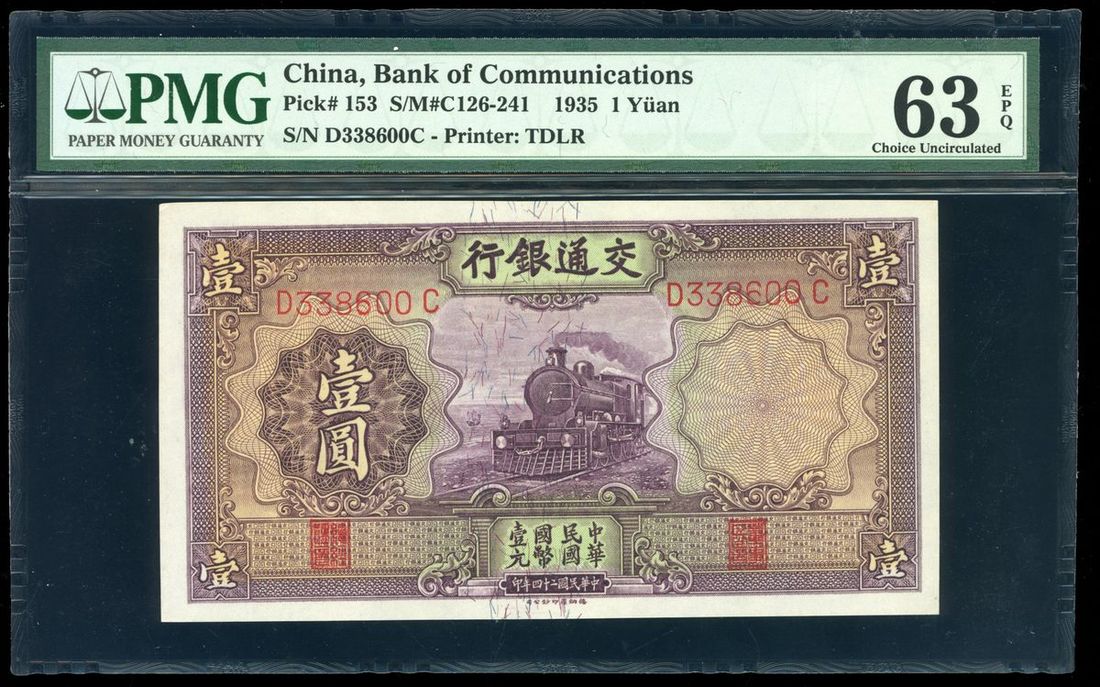 Bank of Communications, China, 1 yuan, Year 24 (1935), serial number D338600C, (Pick 153), PMG 63EPQ