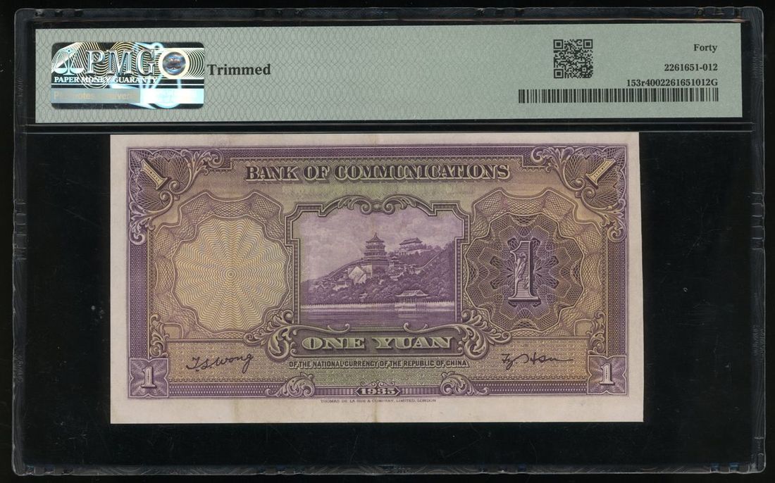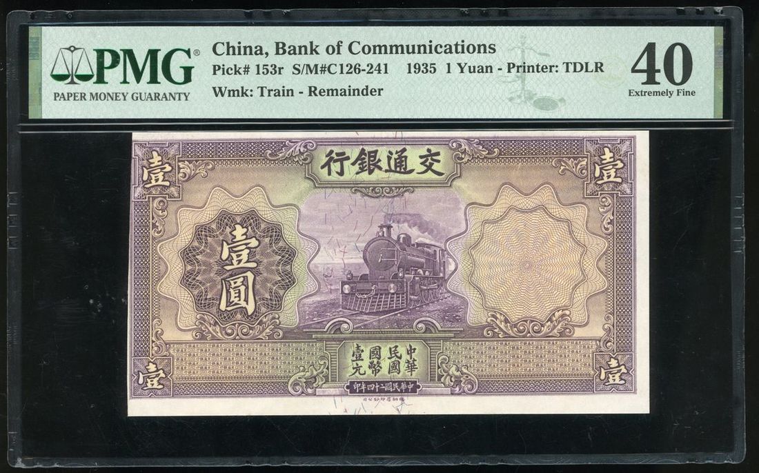 Bank of Communications, China, remainder 1 yuan, Year 24 (1935), no serial numbers, (Pick 153r), PMG 40, trimmed. Remainder quite scarce